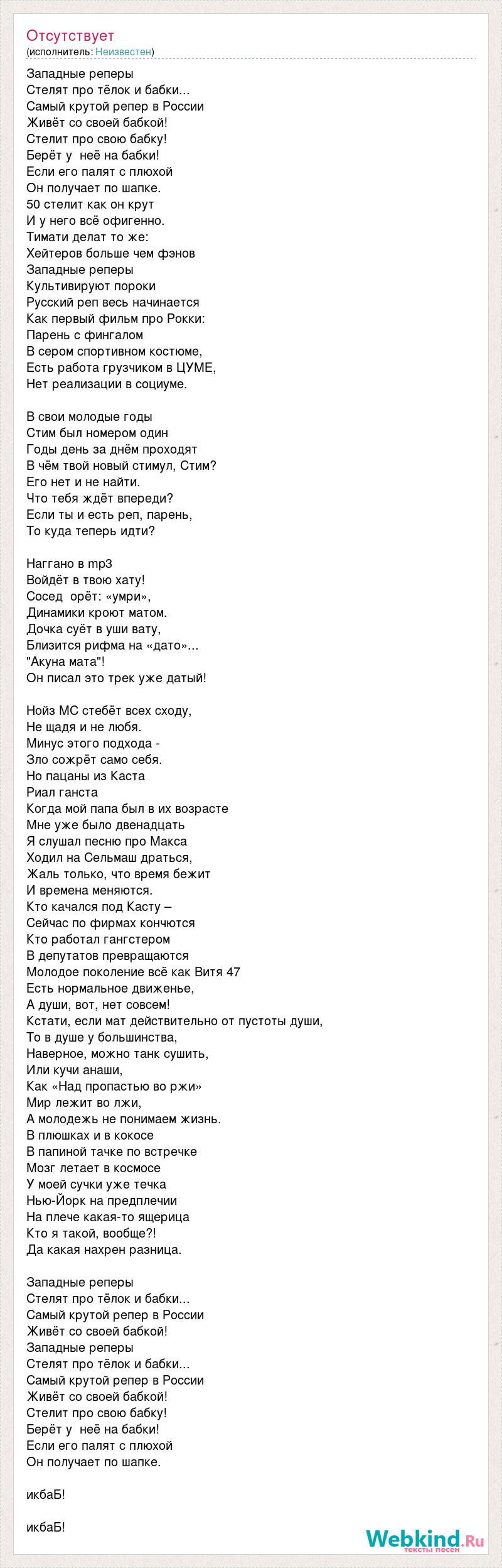 Западные реперы Стелят про тёлок и бабки... Самый крутой репер в России Живёт со своей бабкой! Стелит про свою бабку! Берёт у неё на бабки! Если его палят с плюхой Он получает по шапке. 50 стелит как он крут И у него всё офигенно. Тимати делат то же: Хейтеров больше чем фэнов Западные реперы Культивируют пороки Русский реп весь начинается Как первый фильм про Рокки: Парень с фингалом В сером спортивном костюме, Есть работа грузчиком в ЦУМЕ, Нет реализации в социуме. В свои молодые годы Стим был номером один Годы день за днём проходят В чём твой новый стимул, Стим? Его нет и не найти. Что тебя ждёт впереди? Если ты и есть реп, парень, То куда теперь идти? Наггано в mp3 Войдёт в твою хату! Сосед орёт: «умри», Динамики кроют матом. Дочка суёт в уши вату, Близится рифма на «дато»... "Акуна мата"! Он писал это трек уже датый! Нойз МС стебёт всех сходу, Не щадя и не любя. Минус этого подхода - Зло сожрёт само себя. Но пацаны из Каста Риал ганста Когда мой папа был в их возрасте Мне уже было двенадцать Я слушал песню про Макса Ходил на Сельмаш драться, Жаль только, что время бежит И времена меняются. Кто качался под Касту – Сейчас по фирмах кончются Кто работал гангстером В депутатов превращаются Молодое поколение всё как Витя 47 Есть нормальное движенье, А души, вот, нет совсем! Кстати, если мат действительно от пустоты души, То в душе у большинства, Наверное, можно танк сушить, Или кучи анаши, Как «Над пропастью во ржи» Мир лежит во лжи, А молодежь не понимаем жизнь. В плюшках и в кокосе В папиной тачке по встречке Мозг летает в космосе У моей сучки уже течка Нью-Йорк на предплечии На плече какая-то ящерица Кто я такой, вообще?! Да какая нахрен разница. Западные реперы Стелят про тёлок и бабки... Самый крутой репер в России Живёт со своей бабкой! Западные реперы Стелят про тёлок и бабки... Самый крутой репер в России Живёт со своей бабкой! Стелит про свою бабку! Берёт у неё на бабки! Если его палят с плюхой Он получает по шапке. икбаБ! икбаБ!