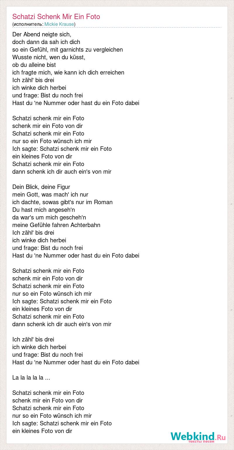 Der Abend neigte sich, doch dann da sah ich dich so ein Gefühl, mit garnichts zu vergleichen Wusste nicht, wen du küsst, ob du alleine bist ich fragte mich, wie kann ich dich erreichen Ich zähl' bis drei ich winke dich herbei und frage: Bist du noch frei Hast du 'ne Nummer oder hast du ein Foto dabei Schatzi schenk mir ein Foto schenk mir ein Foto von dir Schatzi schenk mir ein Foto nur so ein Foto wünsch ich mir Ich sagte: Schatzi schenk mir ein Foto ein kleines Foto von dir Schatzi schenk mir ein Foto dann schenk ich dir auch ein's von mir Dein Blick, deine Figur mein Gott, was mach' ich nur ich dachte, sowas gibt's nur im Roman Du hast mich angeseh'n da war's um mich gescheh'n meine Gefühle fahren Achterbahn Ich zähl' bis drei ich winke dich herbei und frage: Bist du noch frei Hast du 'ne Nummer oder hast du ein Foto dabei Schatzi schenk mir ein Foto schenk mir ein Foto von dir Schatzi schenk mir ein Foto nur so ein Foto wünsch ich mir Ich sagte: Schatzi schenk mir ein Foto ein kleines Foto von dir Schatzi schenk mir ein Foto dann schenk ich dir auch ein's von mir Ich zähl' bis drei ich winke dich herbei und frage: Bist du noch frei Hast du 'ne Nummer oder hast du ein Foto dabei La la la la la ... Schatzi schenk mir ein Foto schenk mir ein Foto von dir Schatzi schenk mir ein Foto nur so ein Foto wünsch ich mir Ich sagte: Schatzi schenk mir ein Foto ein kleines Foto von dir