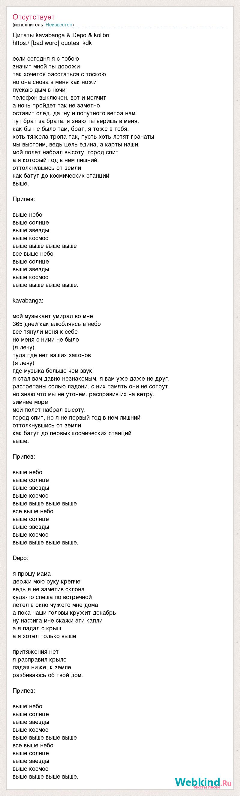 Цитаты kavabanga & Depo & kolibri https:/ [bad word] quotes_kdk если сегодня я с тобою значит мной ты дорожи так хочется расстаться с тоскою но она снова в меня как ножи пускаю дым в ночи телефон выключен. вот и молчит а ночь пройдет так не заметно оставит след. да. ну и попутного ветра нам. тут брат за брата. я знаю ты веришь в меня. как-бы не было там, брат, я тоже в тебя. хоть тяжела тропа так, пусть хоть летят гранаты мы выстоим, ведь цель едина, а карты наши. мой полет набрал высоту, город спит а я который год в нем лишний. оттолкнувшись от земли как батут до космических станций выше. Припев: выше небо выше солнце выше звезды выше космос выше выше выше выше все выше небо выше солнце выше звезды выше космос выше выше выше выше. kavabanga: мой музыкант умирал во мне 365 дней как влюбляясь в небо все тянули меня к себе но меня с ними не было (я лечу) туда где нет ваших законов (я лечу) где музыка больше чем звук я стал вам давно незнакомым. я вам уже даже не друг. растрепаны солью ладони. с них память они не сотрут. но знаю что мы не утонем. расправив их на ветру. зимнее море мой полет набрал высоту. город спит, но я не первый год в нем лишний оттолкнувшись от земли как батут до первых космических станций выше. Припев: выше небо выше солнце выше звезды выше космос выше выше выше выше все выше небо выше солнце выше звезды выше космос выше выше выше выше. Depo: я прошу мама держи мою руку крепче ведь я не заметив склона куда-то спеша по встречной летел в окно чужого мне дома а пока наши головы кружит декабрь ну нафига мне скажи эти капли а я падал с крыш а я хотел только выше притяжения нет я расправил крыло падая ниже, к земле разбиваюсь об твой дом. Припев: выше небо выше солнце выше звезды выше космос выше выше выше выше все выше небо выше солнце выше звезды выше космос выше выше выше выше.
