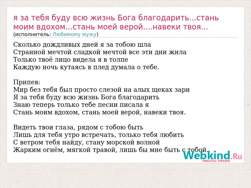 Сколько дождливых дней я за тобою шла Странной мечтой сладкой мечтой все эти дни жила Только твоё лицо видела я в толпе Каждую ночь кутаясь в плед думала о тебе. Припев: Мир без тебя был просто слезой на алых щеках зари Я за тебя буду всю жизнь Бога благодарить Знаю теперь только тебе песни писала я Стань моим вдохом, стань моей верой, навеки твоя. Видеть твои глаза, рядом с тобою быть Лишь для тебя утро встречать, только тебя любить С ветром тебя найду, стану морской волной Жарким огнём, мягкой травой, лишь бы мне быть с тобой.