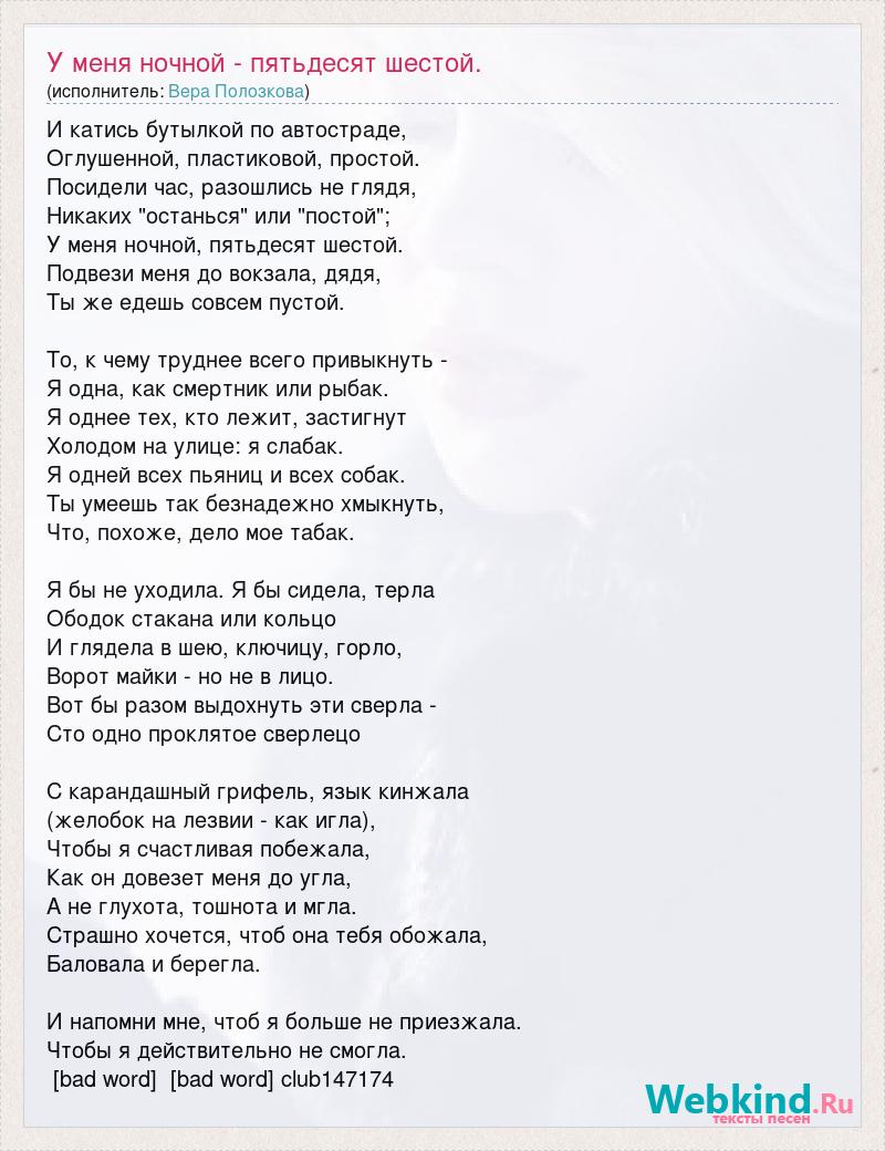 И катись бутылкой по автостраде, Оглушенной, пластиковой, простой. Посидели час, разошлись не глядя, Никаких "останься" или "постой"; У меня ночной, пятьдесят шестой. Подвези меня до вокзала, дядя, Ты же едешь совсем пустой. То, к чему труднее всего привыкнуть - Я одна, как смертник или рыбак. Я однее тех, кто лежит, застигнут Холодом на улице: я слабак. Я одней всех пьяниц и всех собак. Ты умеешь так безнадежно хмыкнуть, Что, похоже, дело мое табак. Я бы не уходила. Я бы сидела, терла Ободок стакана или кольцо И глядела в шею, ключицу, горло, Ворот майки - но не в лицо. Вот бы разом выдохнуть эти сверла - Сто одно проклятое сверлецо С карандашный грифель, язык кинжала (желобок на лезвии - как игла), Чтобы я счастливая побежала, Как он довезет меня до угла, А не глухота, тошнота и мгла. Страшно хочется, чтоб она тебя обожала, Баловала и берегла. И напомни мне, чтоб я больше не приезжала. Чтобы я действительно не смогла. [bad word] [bad word] club147174
