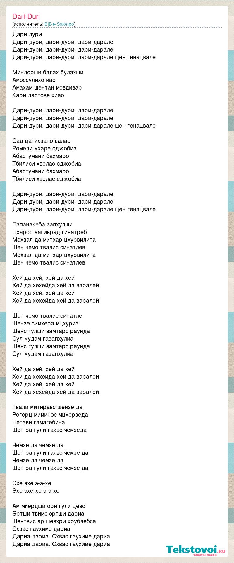 Дари дури Дари-дури, дари-дури, дари-дарале Дари-дури, дари-дури, дари-дарале Дари-дури, дари-дури, дари-дарале щен генацвале Миндорши балах булахши Амоссулихо иао Амахам шентан мовдивар Кари дастове хиао Дари-дури, дари-дури, дари-дарале Дари-дури, дари-дури, дари-дарале Дари-дури, дари-дури, дари-дарале щен генацвале Сад цагихвано калао Ромели мхаре сджобиа Абастумани бахмаро Тбилиси хвелас сджобиа Абастумани бахмаро Тбилиси хвелас сджобиа Дари-дури, дари-дури, дари-дарале Дари-дури, дари-дури, дари-дарале Дари-дури, дари-дури, дари-дарале щен генацвале Папанакеба запхулши Цхарос магиврад гинатреб Мохвал да митхар цхурвилита Шен чемо твалис синатлев Мохвал да митхар цхурвилита Шен чемо твалис синатлев Хей да хей, хей да хей Хей да хехейда хей да варалей Хей да хей, хей да хей Хей да хехейда хей да варалей Шен чемо твалис синатле Шензе симхера мцхуриа Шенс гулши замтарс раунда Сул мудам газапхулиа Шенс гулши замтарс раунда Сул мудам газапхулиа Хей да хей, хей да хей Хей да хехейда хей да варалей Хей да хей, хей да хей Хей да хехейда хей да варалей Твали митиравс шензе да Рогорц миминос мцхерзеда Нетави гамагебина Шен ра гули гаквс чемзеда Чемзе да чемзе да Шен ра гули гаквс чемзе да Чемзе да чемзе да Шен ра гули гаквс чемзе да Эхе эхе э-э-хе Эхе эхе-хе э-э-хе Ам мкердши ори гули цевс Эртши твимс эртши дариа Шентвис ар шевхри хрублебса Схвас гаухиме дариа Дариа дариа. Схвас гаухиме дариа Дариа дариа. Схвас гаухиме дариа