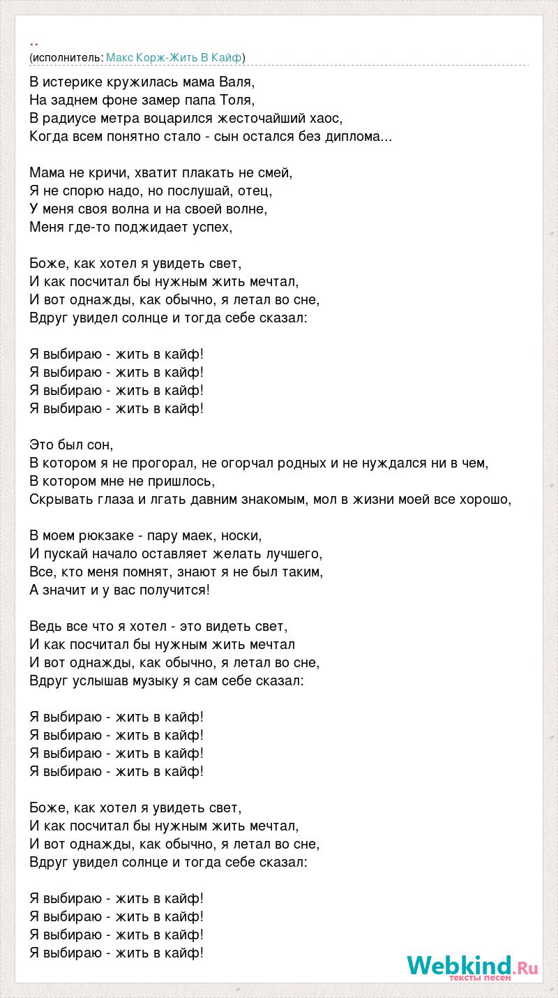В истерике кружилась мама Валя, На заднем фоне замер папа Толя, В радиусе метра воцарился жесточайший хаос, Когда всем понятно стало - сын остался без диплома... Мама не кричи, хватит плакать не смей, Я не спорю надо, но послушай, отец, У меня своя волна и на своей волне, Меня где-то поджидает успех, Боже, как хотел я увидеть свет, И как посчитал бы нужным жить мечтал, И вот однажды, как обычно, я летал во сне, Вдруг увидел солнце и тогда себе сказал: Я выбираю - жить в кайф! Я выбираю - жить в кайф! Я выбираю - жить в кайф! Я выбираю - жить в кайф! Это был сон, В котором я не прогорал, не огорчал родных и не нуждался ни в чем, В котором мне не пришлось, Скрывать глаза и лгать давним знакомым, мол в жизни моей все хорошо, В моем рюкзаке - пару маек, носки, И пускай начало оставляет желать лучшего, Все, кто меня помнят, знают я не был таким, А значит и у вас получится! Ведь все что я хотел - это видеть свет, И как посчитал бы нужным жить мечтал И вот однажды, как обычно, я летал во сне, Вдруг услышав музыку я сам себе сказал: Я выбираю - жить в кайф! Я выбираю - жить в кайф! Я выбираю - жить в кайф! Я выбираю - жить в кайф! Боже, как хотел я увидеть свет, И как посчитал бы нужным жить мечтал, И вот однажды, как обычно, я летал во сне, Вдруг увидел солнце и тогда себе сказал: Я выбираю - жить в кайф! Я выбираю - жить в кайф! Я выбираю - жить в кайф! Я выбираю - жить в кайф!