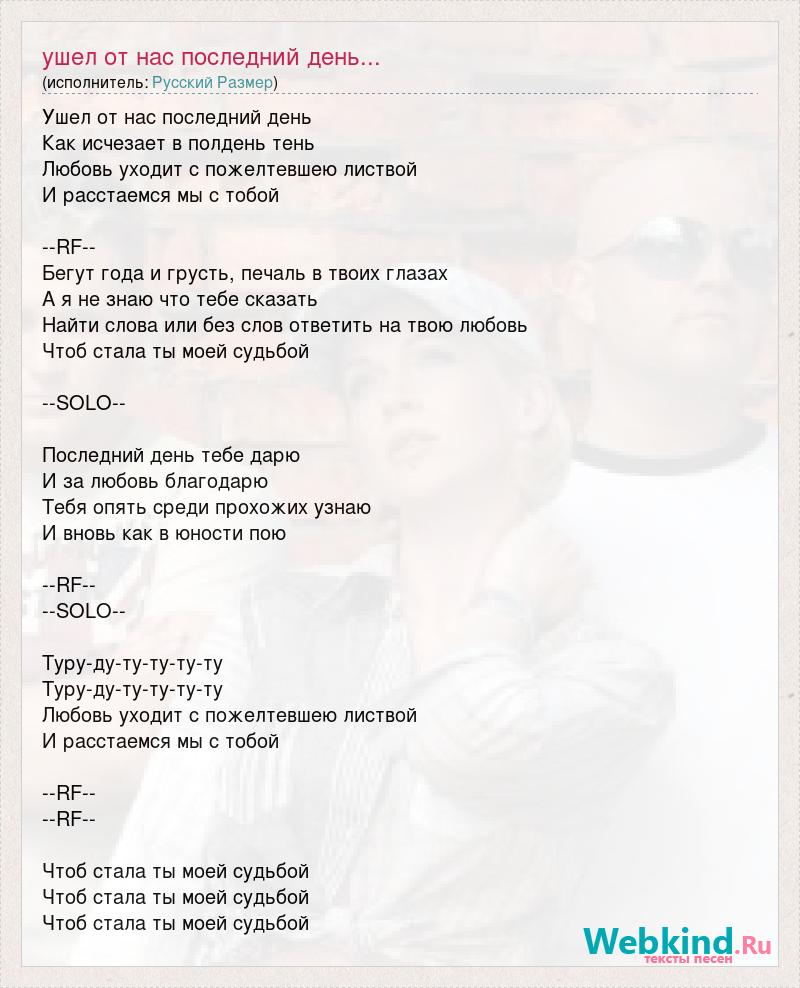Ушел от нас последний день Как исчезает в полдень тень Любовь уходит с пожелтевшею листвой И расстаемся мы с тобой --RF-- Бегут года и грусть, печаль в твоих глазах А я не знаю что тебе сказать Найти слова или без слов ответить на твою любовь Чтоб стала ты моей судьбой --SOLO-- Последний день тебе дарю И за любовь благодарю Тебя опять среди прохожих узнаю И вновь как в юности пою --RF-- --SOLO-- Туру-ду-ту-ту-ту-ту Туру-ду-ту-ту-ту-ту Любовь уходит с пожелтевшею листвой И расстаемся мы с тобой --RF-- --RF-- Чтоб стала ты моей судьбой Чтоб стала ты моей судьбой Чтоб стала ты моей судьбой