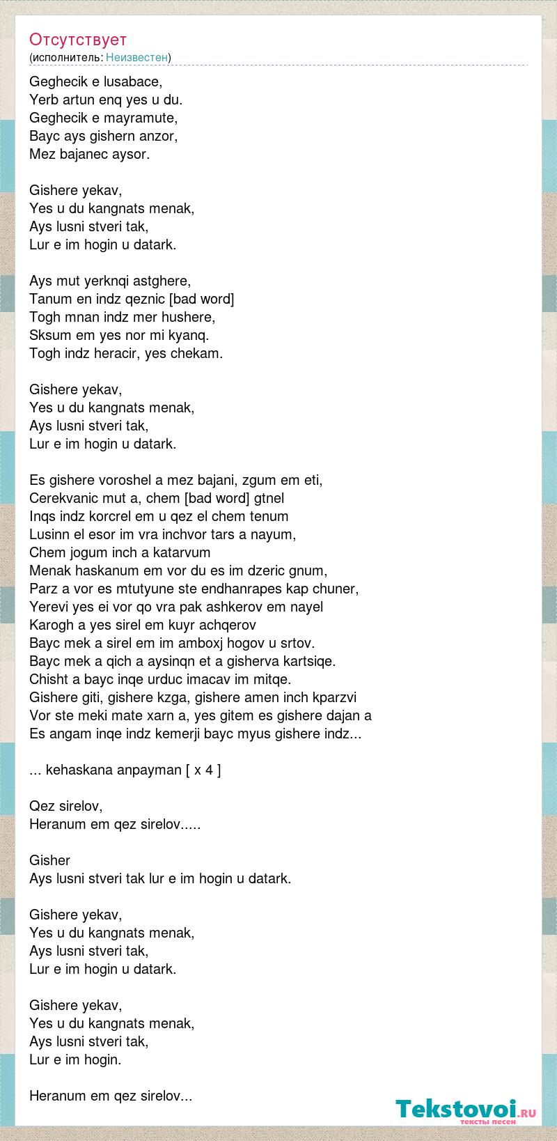 Geghecik e lusabace, Yerb artun enq yes u du. Geghecik e mayramute, Bayc ays gishern anzor, Mez bajanec aysor. Gishere yekav, Yes u du kangnats menak, Ays lusni stveri tak, Lur e im hogin u datark. Ays mut yerknqi astghere, Tanum en indz qeznic heru, Togh mnan indz mer hushere, Sksum em yes nor mi kyanq. Togh indz heracir, yes chekam. Gishere yekav, Yes u du kangnats menak, Ays lusni stveri tak, Lur e im hogin u datark. Es gishere voroshel a mez bajani, zgum em eti, Cerekvanic mut a, chem karum gtnel Inqs indz korcrel em u qez el chem tenum Lusinn el esor im vra inchvor tars a nayum, Chem jogum inch a katarvum Menak haskanum em vor du es im dzeric gnum, Parz a vor es mtutyune ste endhanrapes kap chuner, Yerevi yes ei vor qo vra pak ashkerov em nayel Karogh a yes sirel em kuyr achqerov Bayc mek a sirel em im amboxj hogov u srtov. Bayc mek a qich a aysinqn et a gisherva kartsiqe. Chisht a bayc inqe urduc imacav im mitqe. Gishere giti, gishere kzga, gishere amen inch kparzvi Vor ste meki mate xarn a, yes gitem es gishere dajan a Es angam inqe indz kemerji bayc myus gishere indz... ... kehaskana anpayman [ x 4 ] Qez sirelov, Heranum em qez sirelov..... Gisher Ays lusni stveri tak lur e im hogin u datark. Gishere yekav, Yes u du kangnats menak, Ays lusni stveri tak, Lur e im hogin u datark. Gishere yekav, Yes u du kangnats menak, Ays lusni stveri tak, Lur e im hogin. Heranum em qez sirelov...