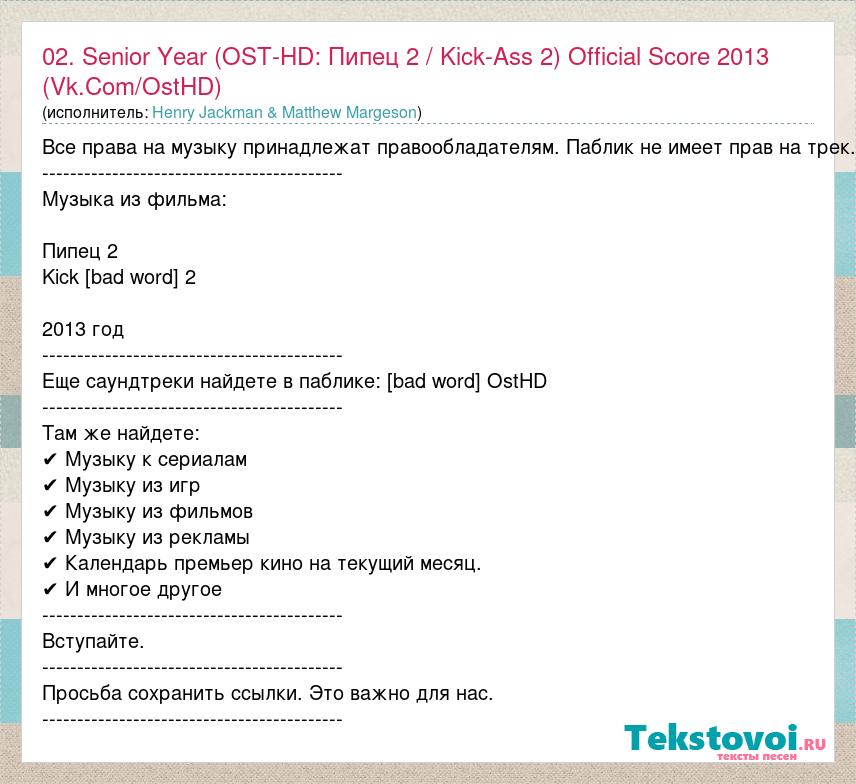 Все права на музыку принадлежат правообладателям. Паблик не имеет прав на трек. ------------------------------------------- Музыка из фильма: Пипец 2 Kick [bad word] 2 2013 год ------------------------------------------- Еще саундтреки найдете в паблике: [bad word] OstHD ------------------------------------------- Там же найдете: ✔ Музыку к сериалам ✔ Музыку из игр ✔ Музыку из фильмов ✔ Музыку из рекламы ✔ Календарь премьер кино на текущий месяц. ✔ И многое другое ------------------------------------------- Вступайте. ------------------------------------------- Просьба сохранить ссылки. Это важно для нас. -------------------------------------------
