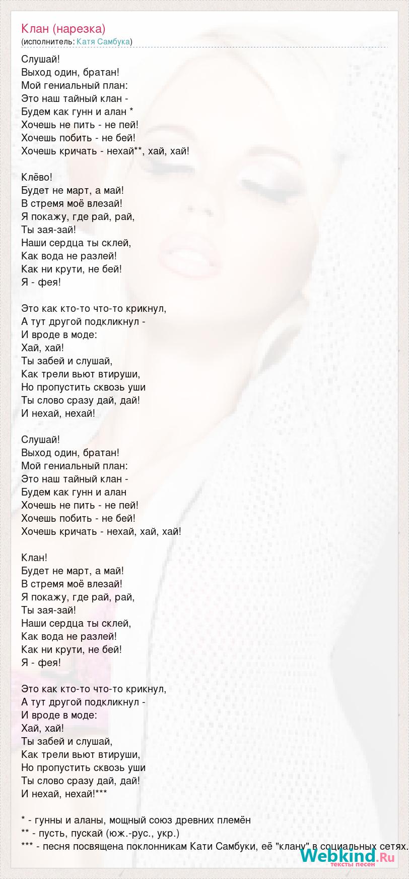 Слушай! Выход один, братан! Мой гениальный план: Это наш тайный клан - Будем как гунн и алан * Хочешь не пить - не пей! Хочешь побить - не бей! Хочешь кричать - нехай**, хай, хай! Клёво! Будет не март, а май! В стремя моё влезай! Я покажу, где рай, рай, Ты зая-зай! Наши сердца ты склей, Как вода не разлей! Как ни крути, не бей! Я - фея! Это как кто-то что-то крикнул, А тут другой подкликнул - И вроде в моде: Хай, хай! Ты забей и слушай, Как трели вьют втируши, Но пропустить сквозь уши Ты слово сразу дай, дай! И нехай, нехай! Слушай! Выход один, братан! Мой гениальный план: Это наш тайный клан - Будем как гунн и алан Хочешь не пить - не пей! Хочешь побить - не бей! Хочешь кричать - нехай, хай, хай! Клан! Будет не март, а май! В стремя моё влезай! Я покажу, где рай, рай, Ты зая-зай! Наши сердца ты склей, Как вода не разлей! Как ни крути, не бей! Я - фея! Это как кто-то что-то крикнул, А тут другой подкликнул - И вроде в моде: Хай, хай! Ты забей и слушай, Как трели вьют втируши, Но пропустить сквозь уши Ты слово сразу дай, дай! И нехай, нехай!*** * - гунны и аланы, мощный союз древних племён ** - пусть, пускай (юж.-рус., укр.) *** - песня посвящена поклонникам Кати Самбуки, её "клану" в социальных сетях.