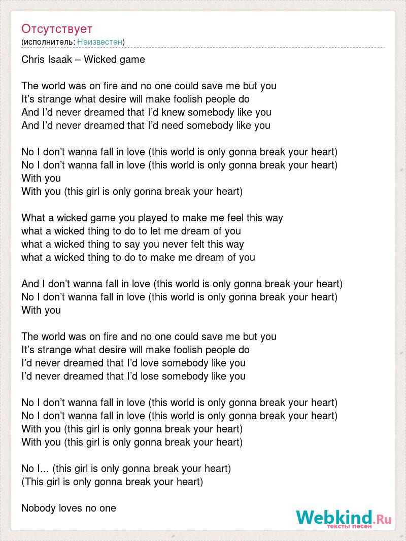 Chris Isaak – Wicked game The world was on fire and no one could save me but you It’s strange what desire will make foolish people do And I’d never dreamed that I’d knew somebody like you And I’d never dreamed that I’d need somebody like you No I don’t wanna fall in love (this world is only gonna break your heart) No I don’t wanna fall in love (this world is only gonna break your heart) With you With you (this girl is only gonna break your heart) What a wicked game you played to make me feel this way what a wicked thing to do to let me dream of you what a wicked thing to say you never felt this way what a wicked thing to do to make me dream of you And I don’t wanna fall in love (this world is only gonna break your heart) No I don’t wanna fall in love (this world is only gonna break your heart) With you The world was on fire and no one could save me but you It’s strange what desire will make foolish people do I’d never dreamed that I’d love somebody like you I’d never dreamed that I’d lose somebody like you No I don’t wanna fall in love (this world is only gonna break your heart) No I don’t wanna fall in love (this world is only gonna break your heart) With you (this girl is only gonna break your heart) With you (this girl is only gonna break your heart) No I... (this girl is only gonna break your heart) (This girl is only gonna break your heart) Nobody loves no one