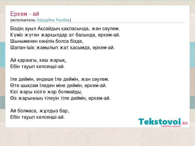 Біздің ауыл Ақсайдың қақпасында, жан сәулем. Күміс жүген жарқылдар ат басында, еркем-ай. Шыныменен көңілің болса бізде, Шапан-ішік жамылып жат қасымда, еркем-ай. Ай қараңғы, кеш жарық, Ебін тауып келсеңші-ай. Іле деймін, ендеше Іле деймін, жан сәулем. Өте шықсам Іледен міне деймін, еркем-ай. Кісі жары кісіге жар болмайды, Өз жарыңның тілеуін тіле деймін, еркем-ай. Ай болмаса, жұлдыз бар, Ебін тауып келсеңші-ай.