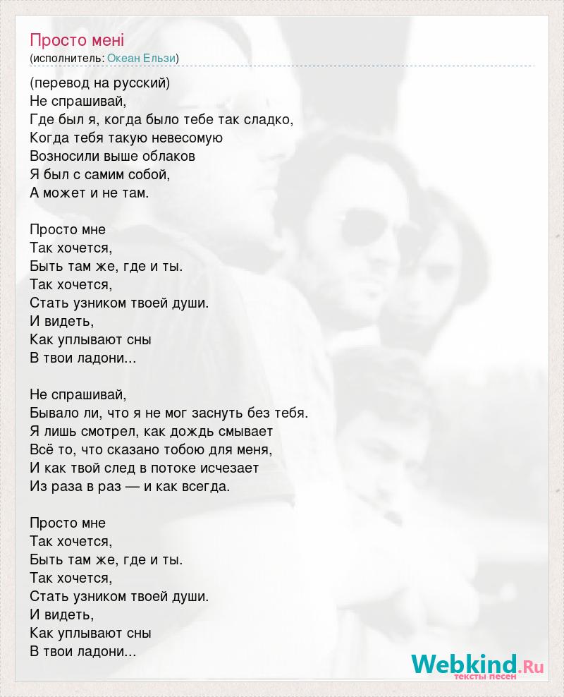 (перевод на русский) Не спрашивай, Где был я, когда было тебе так сладко, Когда тебя такую невесомую Возносили выше облаков Я был с самим собой, А может и не там. Просто мне Так хочется, Быть там же, где и ты. Так хочется, Стать узником твоей души. И видеть, Как уплывают сны В твои ладони... Не спрашивай, Бывало ли, что я не мог заснуть без тебя. Я лишь смотрел, как дождь смывает Всё то, что сказано тобою для меня, И как твой след в потоке исчезает Из раза в раз — и как всегда. Просто мне Так хочется, Быть там же, где и ты. Так хочется, Стать узником твоей души. И видеть, Как уплывают сны В твои ладони...