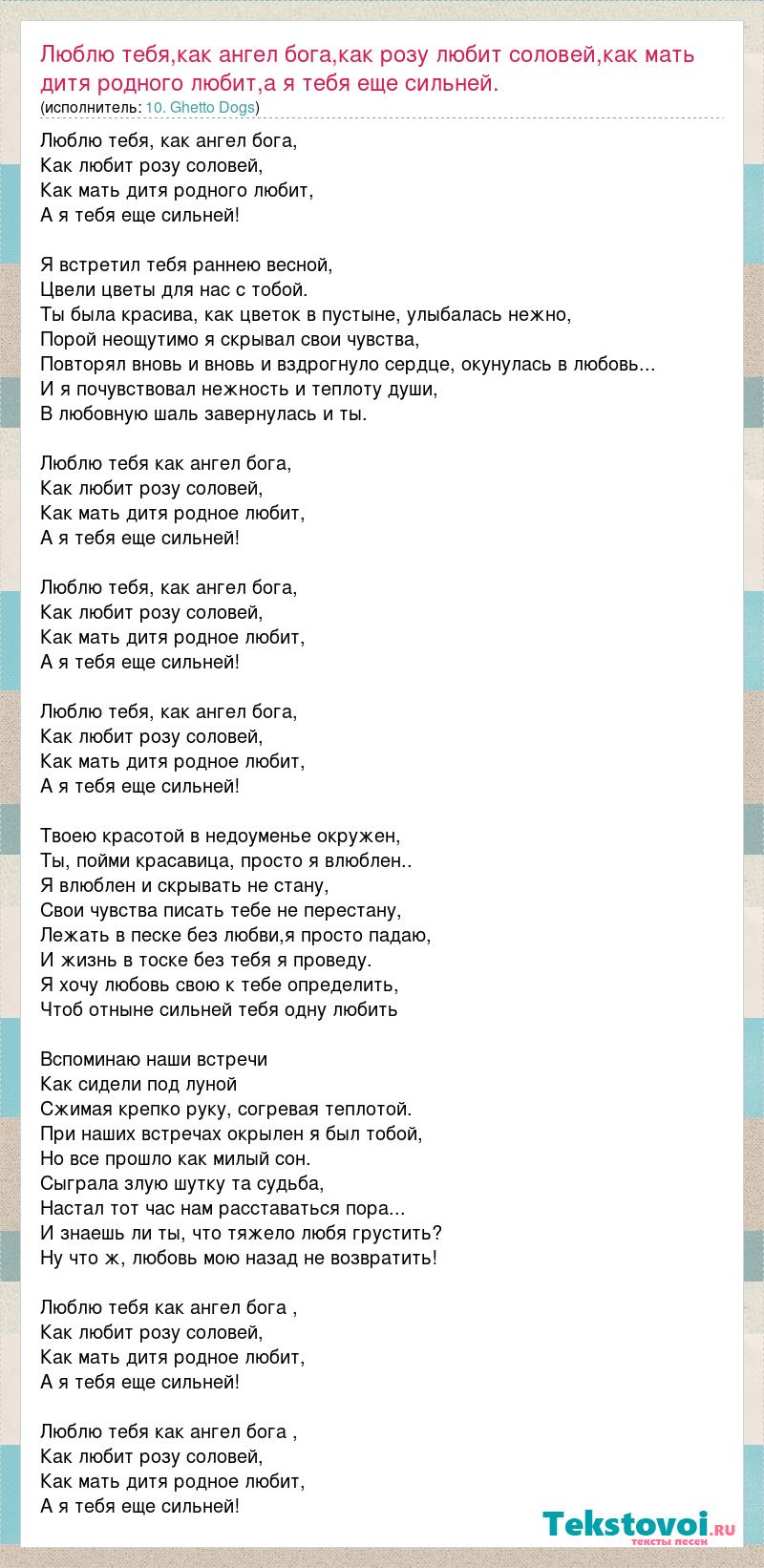 Люблю тебя, как ангел бога, Как любит розу соловей, Как мать дитя родного любит, А я тебя еще сильней! Я встретил тебя раннею весной, Цвели цветы для нас с тобой. Ты была красива, как цветок в пустыне, улыбалась нежно, Порой неощутимо я скрывал свои чувства, Повторял вновь и вновь и вздрогнуло сердце, окунулась в любовь... И я почувствовал нежность и теплоту души, В любовную шаль завернулась и ты. Люблю тебя как ангел бога, Как любит розу соловей, Как мать дитя родное любит, А я тебя еще сильней! Люблю тебя, как ангел бога, Как любит розу соловей, Как мать дитя родное любит, А я тебя еще сильней! Люблю тебя, как ангел бога, Как любит розу соловей, Как мать дитя родное любит, А я тебя еще сильней! Твоею красотой в недоуменье окружен, Ты, пойми красавица, просто я влюблен.. Я влюблен и скрывать не стану, Свои чувства писать тебе не перестану, Лежать в песке без любви,я просто падаю, И жизнь в тоске без тебя я проведу. Я хочу любовь свою к тебе определить, Чтоб отныне сильней тебя одну любить Вспоминаю наши встречи Как сидели под луной Сжимая крепко руку, согревая теплотой. При наших встречах окрылен я был тобой, Но все прошло как милый сон. Сыграла злую шутку та судьба, Настал тот час нам расставаться пора... И знаешь ли ты, что тяжело любя грустить? Ну что ж, любовь мою назад не возвратить! Люблю тебя как ангел бога , Как любит розу соловей, Как мать дитя родное любит, А я тебя еще сильней! Люблю тебя как ангел бога , Как любит розу соловей, Как мать дитя родное любит, А я тебя еще сильней!