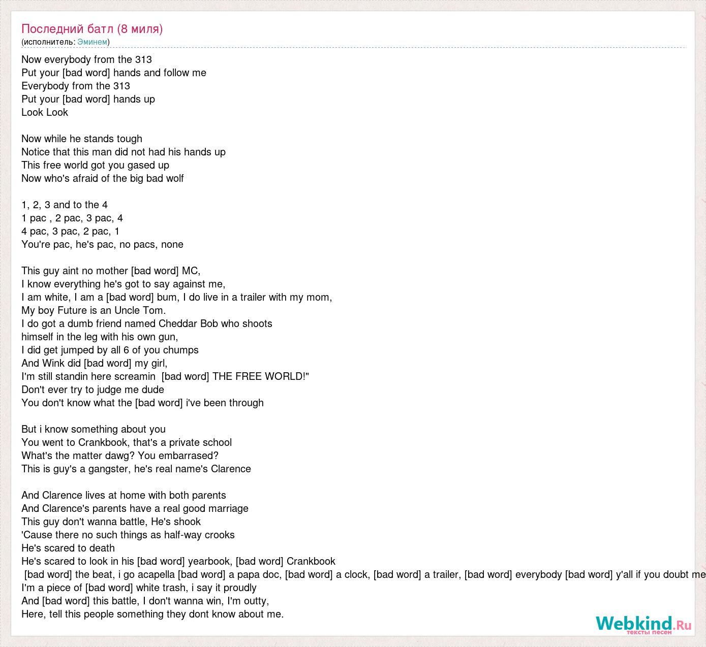 Now everybody from the 313 Put your [bad word] hands and follow me Everybody from the 313 Put your [bad word] hands up Look Look Now while he stands tough Notice that this man did not had his hands up This free world got you gased up Now who's afraid of the big bad wolf 1, 2, 3 and to the 4 1 pac , 2 pac, 3 pac, 4 4 pac, 3 pac, 2 pac, 1 You're pac, he's pac, no pacs, none This guy aint no mother [bad word] MC, I know everything he's got to say against me, I am white, I am a [bad word] bum, I do live in a trailer with my mom, My boy Future is an Uncle Tom. I do got a dumb friend named Cheddar Bob who shoots himself in the leg with his own gun, I did get jumped by all 6 of you chumps And Wink did [bad word] my girl, I'm still standin here screamin [bad word] THE FREE WORLD!" Don't ever try to judge me dude You don't know what the [bad word] i've been through But i know something about you You went to Crankbook, that's a private school What's the matter dawg? You embarrased? This is guy's a gangster, he's real name's Clarence And Clarence lives at home with both parents And Clarence's parents have a real good marriage This guy don't wanna battle, He's shook 'Cause there no such things as half-way crooks He's scared to death He's scared to look in his [bad word] yearbook, [bad word] Crankbook [bad word] the beat, i go acapella [bad word] a papa doc, [bad word] a clock, [bad word] a trailer, [bad word] everybody [bad word] y'all if you doubt me I'm a piece of [bad word] white trash, i say it proudly And [bad word] this battle, I don't wanna win, I'm outty, Here, tell this people something they dont know about me.