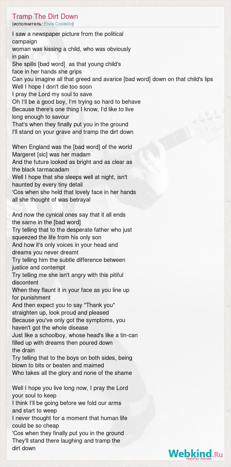 I saw a newspaper picture from the political campaign woman was kissing a child, who was obviously in pain She spills [bad word] as that young child's face in her hands she grips Can you imagine all that greed and avarice [bad word] down on that child's lips Well I hope I don't die too soon I pray the Lord my soul to save Oh I'll be a good boy, I'm trying so hard to behave Because there's one thing I know, I'd like to live long enough to savour That's when they finally put you in the ground I'll stand on your grave and tramp the dirt down When England was the [bad word] of the world Margeret [sic] was her madam And the future looked as bright and as clear as the black tarmacadam Well I hope that she sleeps well at night, isn't haunted by every tiny detail 'Cos when she held that lovely face in her hands all she thought of was betrayal And now the cynical ones say that it all ends the same in the [bad word] Try telling that to the desperate father who just squeezed the life from his only son And how it's only voices in your head and dreams you never dreamt Try telling him the subtle difference between justice and contempt Try telling me she isn't angry with this pitiful discontent When they flaunt it in your face as you line up for punishment And then expect you to say "Thank you" straighten up, look proud and pleased Because you've only got the symptoms, you haven't got the whole disease Just like a schoolboy, whose head's like a tin-can filled up with dreams then poured down the drain Try telling that to the boys on both sides, being blown to bits or beaten and maimed Who takes all the glory and none of the shame Well I hope you live long now, I pray the Lord your soul to keep I think I'll be going before we fold our arms and start to weep I never thought for a moment that human life could be so cheap 'Cos when they finally put you in the ground They'll stand there laughing and tramp the dirt down