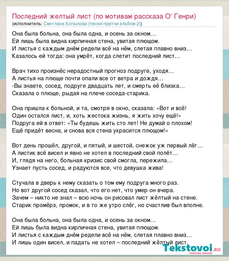 Главная→Исполнители→Светлана Копылова (песни-притчи альбом 2)→Последний желтый лист (по мотивам рассказа О' Генри)