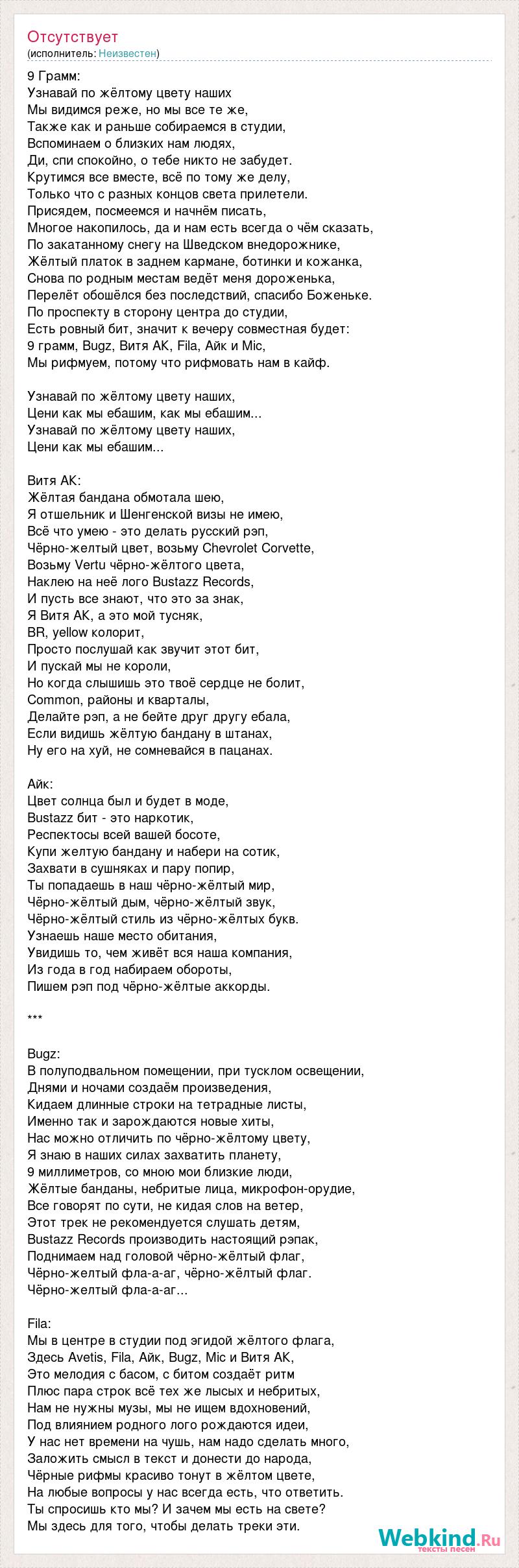 9 Грамм: Узнавай по жёлтому цвету наших Мы видимся реже, но мы все те же, Также как и раньше собираемся в студии, Вспоминаем о близких нам людях, Ди, спи спокойно, о тебе никто не забудет. Крутимся все вместе, всё по тому же делу, Только что с разных концов света прилетели. Присядем, посмеемся и начнём писать, Многое накопилось, да и нам есть всегда о чём сказать, По закатанному снегу на Шведском внедорожнике, Жёлтый платок в заднем кармане, ботинки и кожанка, Снова по родным местам ведёт меня дороженька, Перелёт обошёлся без последствий, спасибо Боженьке. По проспекту в сторону центра до студии, Есть ровный бит, значит к вечеру совместная будет: 9 грамм, Bugz, Витя АК, Fila, Айк и Mic, Мы рифмуем, потому что рифмовать нам в кайф. Узнавай по жёлтому цвету наших, Цени как мы ебашим, как мы ебашим... Узнавай по жёлтому цвету наших, Цени как мы ебашим... Витя АК: Жёлтая бандана обмотала шею, Я отшельник и Шенгенской визы не имею, Всё что умею - это делать русский рэп, Чёрно-желтый цвет, возьму Chevrolet Corvette, Возьму Vertu чёрно-жёлтого цвета, Наклею на неё лого Bustazz Records, И пусть все знают, что это за знак, Я Витя АК, а это мой тусняк, BR, yellow колорит, Просто послушай как звучит этот бит, И пускай мы не короли, Но когда слышишь это твоё сердце не болит, Common, районы и кварталы, Делайте рэп, а не бейте друг другу ебала, Если видишь жёлтую бандану в штанах, Ну его на хуй, не сомневайся в пацанах. Айк: Цвет солнца был и будет в моде, Bustazz бит - это наркотик, Респектосы всей вашей босоте, Купи желтую бандану и набери на сотик, Захвати в сушняках и пару попир, Ты попадаешь в наш чёрно-жёлтый мир, Чёрно-жёлтый дым, чёрно-жёлтый звук, Чёрно-жёлтый стиль из чёрно-жёлтых букв. Узнаешь наше место обитания, Увидишь то, чем живёт вся наша компания, Из года в год набираем обороты, Пишем рэп под чёрно-жёлтые аккорды. *** Bugz: В полуподвальном помещении, при тусклом освещении, Днями и ночами создаём произведения, Кидаем длинные строки на тетрадные листы, Именно так и зарождаются новые хиты, Нас можно отличить по чёрно-жёлтому цвету, Я знаю в наших силах захватить планету, 9 миллиметров, со мною мои близкие люди, Жёлтые банданы, небритые лица, микрофон-орудие, Все говорят по сути, не кидая слов на ветер, Этот трек не рекомендуется слушать детям, Bustazz Records производить настоящий рэпак, Поднимаем над головой чёрно-жёлтый флаг, Чёрно-желтый фла-а-аг, чёрно-жёлтый флаг. Чёрно-желтый фла-а-аг... Fila: Мы в центре в студии под эгидой жёлтого флага, Здесь Avetis, Fila, Айк, Bugz, Mic и Витя АК, Это мелодия с басом, с битом создаёт ритм Плюс пара строк всё тех же лысых и небритых, Нам не нужны музы, мы не ищем вдохновений, Под влиянием родного лого рождаются идеи, У нас нет времени на чушь, нам надо сделать много, Заложить смысл в текст и донести до народа, Чёрные рифмы красиво тонут в жёлтом цвете, На любые вопросы у нас всегда есть, что ответить. Ты спросишь кто мы? И зачем мы есть на свете? Мы здесь для того, чтобы делать треки эти.