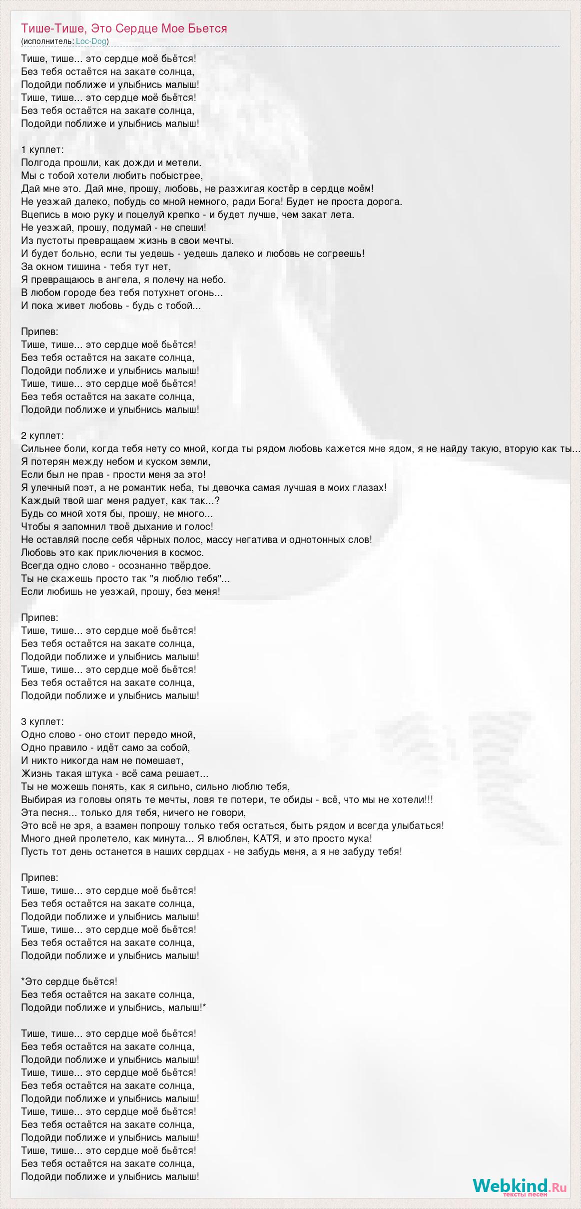 Тише, тише... это сердце моё бьётся! Без тебя остаётся на закате солнца, Подойди поближе и улыбнись малыш! Тише, тише... это сердце моё бьётся! Без тебя остаётся на закате солнца, Подойди поближе и улыбнись малыш! 1 куплет: Полгода прошли, как дожди и метели. Мы с тобой хотели любить побыстрее, Дай мне это. Дай мне, прошу, любовь, не разжигая костёр в сердце моём! Не уезжай далеко, побудь со мной немного, ради Бога! Будет не проста дорога. Вцепись в мою руку и поцелуй крепко - и будет лучше, чем закат лета. Не уезжай, прошу, подумай - не спеши! Из пустоты превращаем жизнь в свои мечты. И будет больно, если ты уедешь - уедешь далеко и любовь не согреешь! За окном тишина - тебя тут нет, Я превращаюсь в ангела, я полечу на небо. В любом городе без тебя потухнет огонь... И пока живет любовь - будь с тобой... Припев: Тише, тише... это сердце моё бьётся! Без тебя остаётся на закате солнца, Подойди поближе и улыбнись малыш! Тише, тише... это сердце моё бьётся! Без тебя остаётся на закате солнца, Подойди поближе и улыбнись малыш! 2 куплет: Сильнее боли, когда тебя нету со мной, когда ты рядом любовь кажется мне ядом, я не найду такую, вторую как ты... Я потерян между небом и куском земли, Если был не прав - прости меня за это! Я улечный поэт, а не романтик неба, ты девочка самая лучшая в моих глазах! Каждый твой шаг меня радует, как так...? Будь со мной хотя бы, прошу, не много... Чтобы я запомнил твоё дыхание и голос! Не оставляй после себя чёрных полос, массу негатива и однотонных слов! Любовь это как приключения в космос. Всегда одно слово - осознанно твёрдое. Ты не скажешь просто так "я люблю тебя"... Если любишь не уезжай, прошу, без меня! Припев: Тише, тише... это сердце моё бьётся! Без тебя остаётся на закате солнца, Подойди поближе и улыбнись малыш! Тише, тише... это сердце моё бьётся! Без тебя остаётся на закате солнца, Подойди поближе и улыбнись малыш! 3 куплет: Одно слово - оно стоит передо мной, Одно правило - идёт само за собой, И никто никогда нам не помешает, Жизнь такая штука - всё сама решает... Ты не можешь понять, как я сильно, сильно люблю тебя, Выбирая из головы опять те мечты, ловя те потери, те обиды - всё, что мы не хотели!!! Эта песня... только для тебя, ничего не говори, Это всё не зря, а взамен попрошу только тебя остаться, быть рядом и всегда улыбаться! Много дней пролетело, как минута... Я влюблен, КАТЯ, и это просто мука! Пусть тот день останется в наших сердцах - не забудь меня, а я не забуду тебя! Припев: Тише, тише... это сердце моё бьётся! Без тебя остаётся на закате солнца, Подойди поближе и улыбнись малыш! Тише, тише... это сердце моё бьётся! Без тебя остаётся на закате солнца, Подойди поближе и улыбнись малыш! *Это сердце бьётся! Без тебя остаётся на закате солнца, Подойди поближе и улыбнись, малыш!* Тише, тише... это сердце моё бьётся! Без тебя остаётся на закате солнца, Подойди поближе и улыбнись малыш! Тише, тише... это сердце моё бьётся! Без тебя остаётся на закате солнца, Подойди поближе и улыбнись малыш! Тише, тише... это сердце моё бьётся! Без тебя остаётся на закате солнца, Подойди поближе и улыбнись малыш! Тише, тише... это сердце моё бьётся! Без тебя остаётся на закате солнца, Подойди поближе и улыбнись малыш!