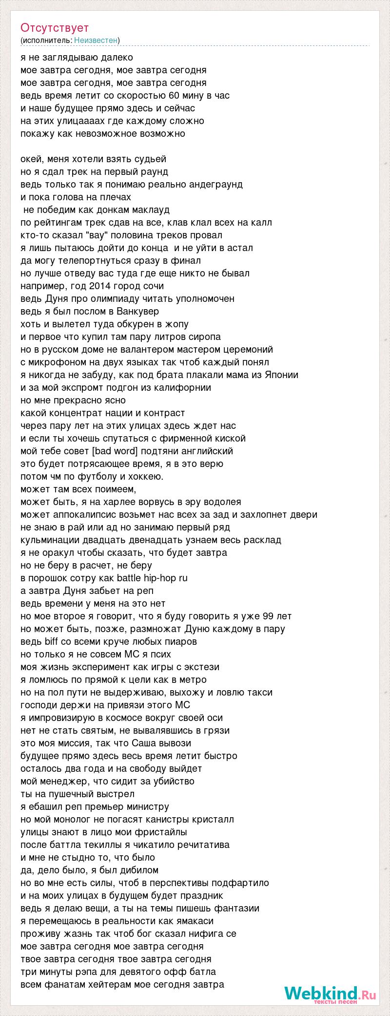я не заглядываю далеко мое завтра сегодня, мое завтра сегодня мое завтра сегодня, мое завтра сегодня ведь время летит со скоростью 60 мину в час и наше будущее прямо здесь и сейчас на этих улицаааах где каждому сложно покажу как невозможное возможно окей, меня хотели взять судьей но я сдал трек на первый раунд ведь только так я понимаю реально андеграунд и пока голова на плечах не победим как донкам маклауд по рейтингам трек сдав на все, клав клал всех на калл кто-то сказал "вау" половина треков провал я лишь пытаюсь дойти до конца и не уйти в астал да могу телепортнуться сразу в финал но лучше отведу вас туда где еще никто не бывал например, год 2014 город сочи ведь Дуня про олимпиаду читать уполномочен ведь я был послом в Ванкувер хоть и вылетел туда обкурен в жопу и первое что купил там пару литров сиропа но в русском доме не валантером мастером церемоний с микрофоном на двух языках так чтоб каждый понял я никогда не забуду, как под брата плакали мама из Японии и за мой экспромт подгон из калифорнии но мне прекрасно ясно какой концентрат нации и контраст через пару лет на этих улицах здесь ждет нас и если ты хочешь спутаться с фирменной киской мой тебе совет [bad word] подтяни английский это будет потрясающее время, я в это верю потом чм по футболу и хоккею. может там всех поимеем, может быть, я на харлее ворвусь в эру водолея может аппокалипсис возьмет нас всех за зад и захлопнет двери не знаю в рай или ад но занимаю первый ряд кульминации двадцать двенадцать узнаем весь расклад я не оракул чтобы сказать, что будет завтра но не беру в расчет, не беру в порошок сотру как battle hip-hop ru а завтра Дуня забьет на реп ведь времени у меня на это нет но мое второе я говорит, что я буду говорить я уже 99 лет но может быть, позже, размножат Дуню каждому в пару ведь biff со всеми круче любых пиаров но только я не совсем МС я псих моя жизнь эксперимент как игры с экстези я ломлюсь по прямой к цели как в метро но на пол пути не выдерживаю, выхожу и ловлю такси господи держи на привязи этого МС я импровизирую в космосе вокруг своей оси нет не стать святым, не вывалявшись в грязи это моя миссия, так что Саша вывози будущее прямо здесь весь время летит быстро осталось два года и на свободу выйдет мой менеджер, что сидит за убийство ты на пушечный выстрел я ебашил реп премьер министру но мой монолог не погасят канистры кристалл улицы знают в лицо мои фристайлы после баттла текиллы я чикатило речитатива и мне не стыдно то, что было да, дело было, я был дибилом но во мне есть силы, чтоб в перспективы подфартило и на моих улицах в будущем будет праздник ведь я делаю вещи, а ты на темы пишешь фантазии я перемещаюсь в реальности как ямакаси проживу жазнь так чтоб бог сказал нифига се мое завтра сегодня мое завтра сегодня твое завтра сегодня твое завтра сегодня три минуты рэпа для девятого офф батла всем фанатам хейтерам мое сегодня завтра