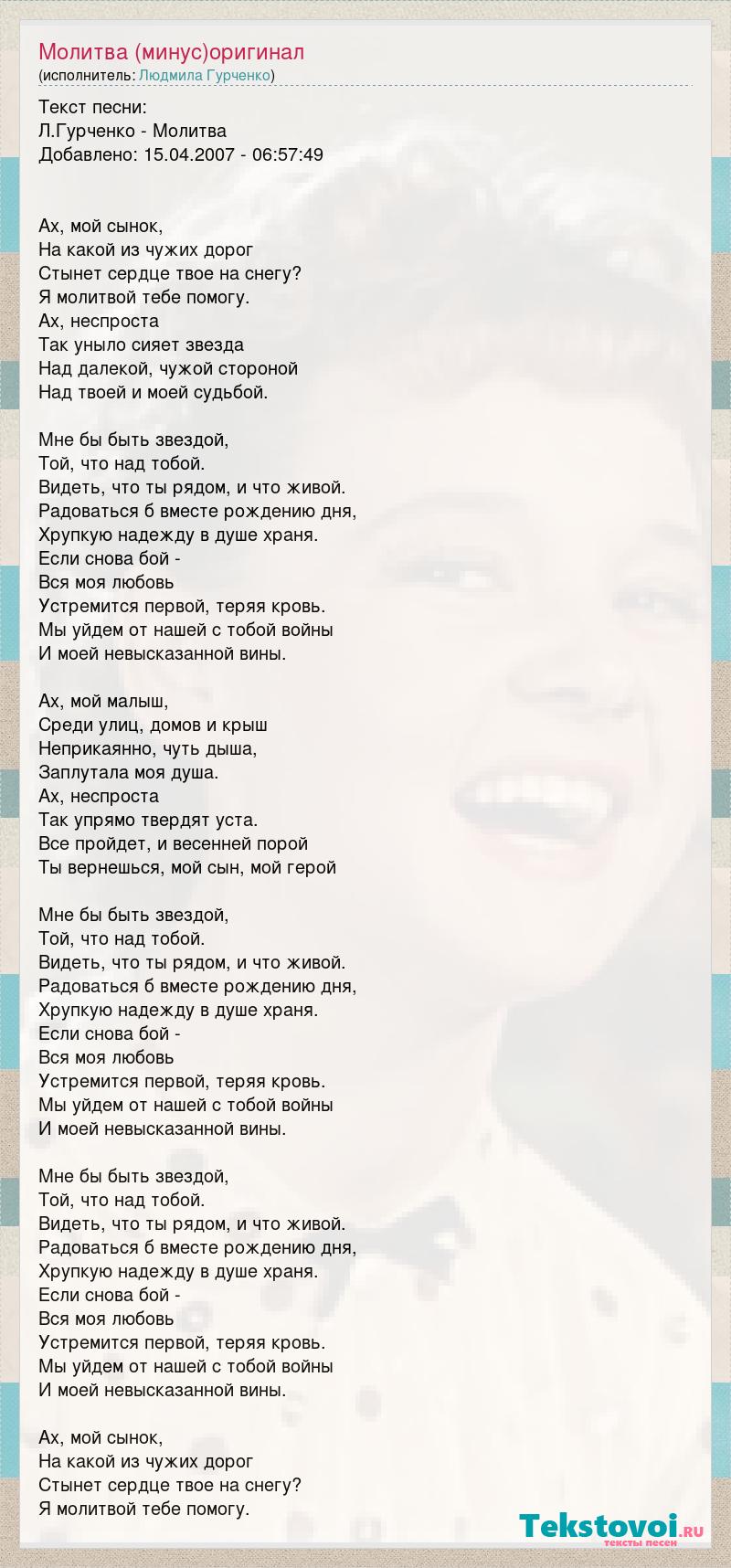 Текст песни: Л.Гурченко - Молитва Добавлено: 15.04.2007 - 06:57:49 Ах, мой сынок, На какой из чужих дорог Стынет сердце твое на снегу? Я молитвой тебе помогу. Ах, неспроста Так уныло сияет звезда Над далекой, чужой стороной Над твоей и моей судьбой. Мне бы быть звездой, Той, что над тобой. Видеть, что ты рядом, и что живой. Радоваться б вместе рождению дня, Хрупкую надежду в душе храня. Если снова бой - Вся моя любовь Устремится первой, теряя кровь. Мы уйдем от нашей с тобой войны И моей невысказанной вины. Ах, мой малыш, Среди улиц, домов и крыш Неприкаянно, чуть дыша, Заплутала моя душа. Ах, неспроста Так упрямо твердят уста. Все пройдет, и весенней порой Ты вернешься, мой сын, мой герой Мне бы быть звездой, Той, что над тобой. Видеть, что ты рядом, и что живой. Радоваться б вместе рождению дня, Хрупкую надежду в душе храня. Если снова бой - Вся моя любовь Устремится первой, теряя кровь. Мы уйдем от нашей с тобой войны И моей невысказанной вины. Мне бы быть звездой, Той, что над тобой. Видеть, что ты рядом, и что живой. Радоваться б вместе рождению дня, Хрупкую надежду в душе храня. Если снова бой - Вся моя любовь Устремится первой, теряя кровь. Мы уйдем от нашей с тобой войны И моей невысказанной вины. Ах, мой сынок, На какой из чужих дорог Стынет сердце твое на снегу? Я молитвой тебе помогу.