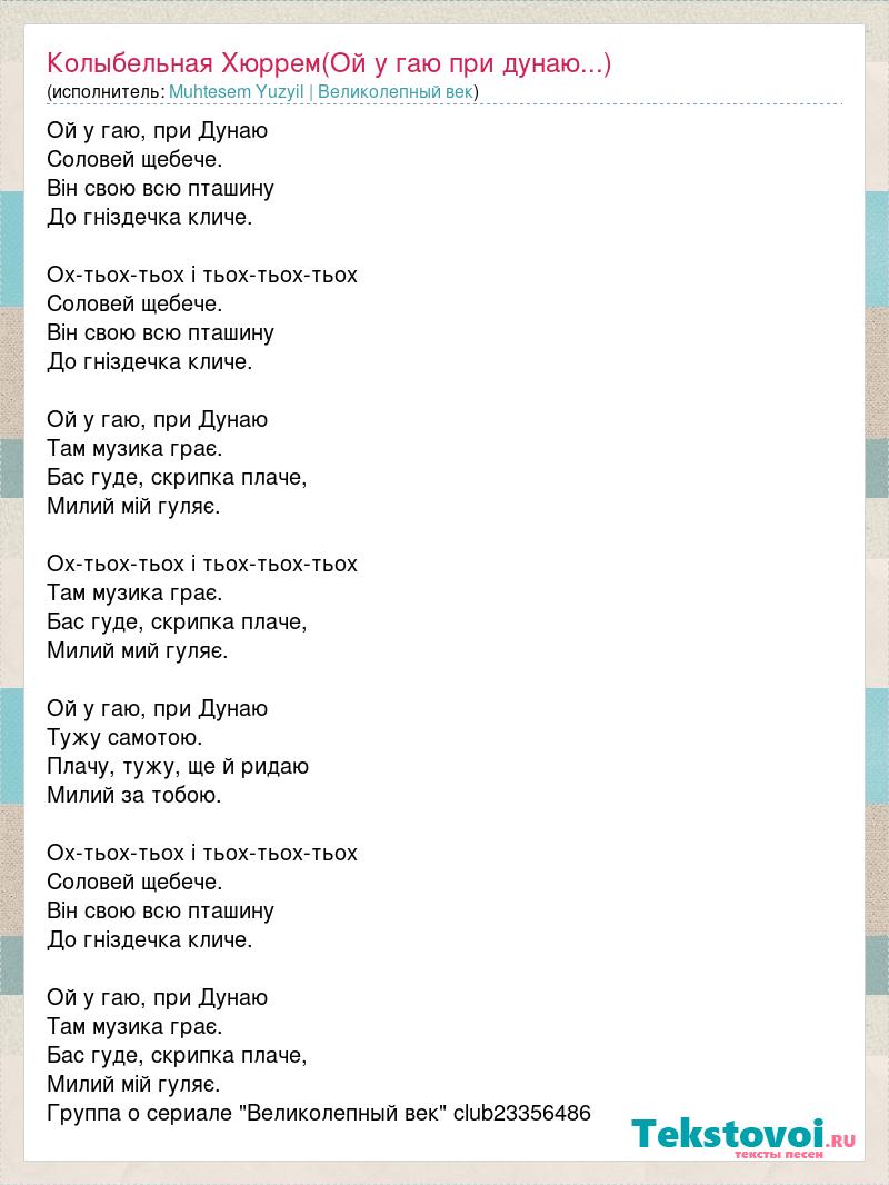 Ой у гаю, при Дунаю Соловей щебече. Він свою всю пташину До гніздечка кличе. Ох-тьох-тьох і тьох-тьох-тьох Соловей щебече. Він свою всю пташину До гніздечка кличе. Ой у гаю, при Дунаю Там музика грає. Бас гуде, скрипка плаче, Милий мій гуляє. Ох-тьох-тьох і тьох-тьох-тьох Там музика грає. Бас гуде, скрипка плаче, Милий мий гуляє. Ой у гаю, при Дунаю Тужу самотою. Плачу, тужу, ще й ридаю Милий за тобою. Ох-тьох-тьох і тьох-тьох-тьох Соловей щебече. Він свою всю пташину До гніздечка кличе. Ой у гаю, при Дунаю Там музика грає. Бас гуде, скрипка плаче, Милий мій гуляє. Группа о сериале "Великолепный век" club23356486