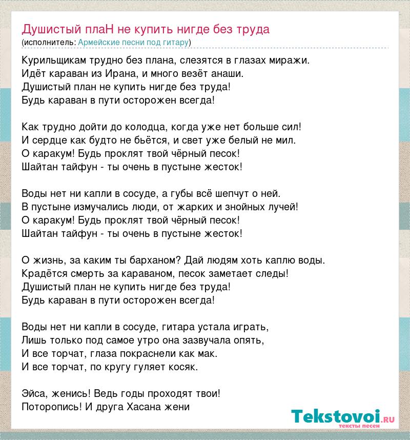 Курильщикам трудно без плана, слезятся в глазах миражи. Идёт караван из Ирана, и много везёт анаши. Душистый план не купить нигде без труда! Будь караван в пути осторожен всегда! Как трудно дойти до колодца, когда уже нет больше сил! И сердце как будто не бьётся, и свет уже белый не мил. О каракум! Будь проклят твой чёрный песок! Шайтан тайфун - ты очень в пустыне жесток! Воды нет ни капли в сосуде, а губы всё шепчут о ней. В пустыне измучались люди, от жарких и знойных лучей! О каракум! Будь проклят твой чёрный песок! Шайтан тайфун - ты очень в пустыне жесток! О жизнь, за каким ты барханом? Дай людям хоть каплю воды. Крадётся смерть за караваном, песок заметает следы! Душистый план не купить нигде без труда! Будь караван в пути осторожен всегда! Воды нет ни капли в сосуде, гитара устала играть, Лишь только под самое утро она зазвучала опять, И все торчат, глаза покраснели как мак. И все торчат, по кругу гуляет косяк. Эйса, женись! Ведь годы проходят твои! Поторопись! И друга Хасана жени