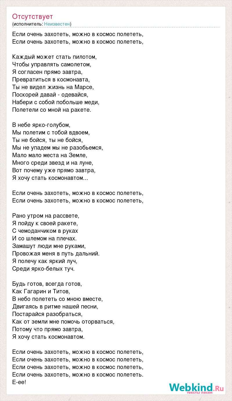 Если очень захотеть, можно в космос полететь, Если очень захотеть, можно в космос полететь, Каждый может стать пилотом, Чтобы управлять самолетом, Я согласен прямо завтра, Превратиться в космонавта, Ты не видел жизнь на Марсе, Поскорей давай - одевайся, Набери с собой побольше меди, Полетели со мной на ракете. В небе ярко-голубом, Мы полетим с тобой вдвоем, Ты не бойся, ты не бойся, Мы не упадем мы не разобьемся, Мало мало места на Земле, Много среди звезд и на луне, Вот почему уже прямо завтра, Я хочу стать космонавтом... Если очень захотеть, можно в космос полететь, Если очень захотеть, можно в космос полететь, Рано утром на рассвете, Я пойду к своей ракете, С чемоданчиком в руках И со шлемом на плечах. Замашут люди мне руками, Провожая меня в путь дальний. Я полечу как яркий луч, Среди ярко-белых туч. Будь готов, всегда готов, Как Гагарин и Титов, В небо полететь со мною вместе, Двигаясь в ритме нашей песни, Постарайся разобраться, Как от земли мне помочь оторваться, Потому что прямо завтра, Я хочу стать космонавтом. Если очень захотеть, можно в космос полететь, Если очень захотеть, можно в космос полететь, Если очень захотеть, можно в космос полететь, Если очень захотеть, можно в космос полететь. Е-ее!