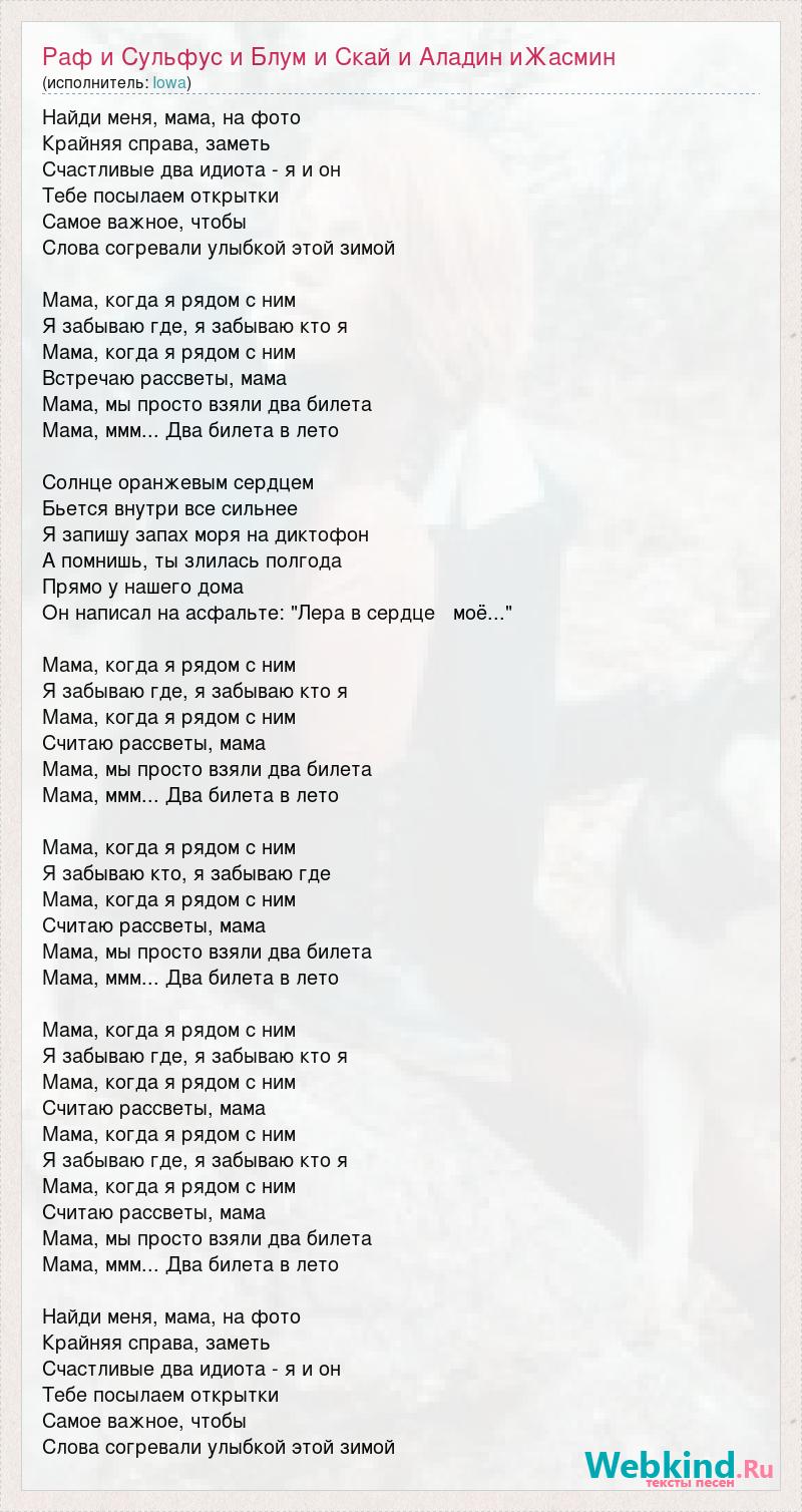 Найди меня, мама, на фото Крайняя справа, заметь Счастливые два идиота - я и он Тебе посылаем открытки Самое важное, чтобы Слова согревали улыбкой этой зимой Мама, когда я рядом с ним Я забываю где, я забываю кто я Мама, когда я рядом с ним Встречаю рассветы, мама Мама, мы просто взяли два билета Мама, ммм... Два билета в лето Солнце оранжевым сердцем Бьется внутри все сильнее Я запишу запах моря на диктофон А помнишь, ты злилась полгода Прямо у нашего дома Он написал на асфальте: "Лера в сердце моё..." Мама, когда я рядом с ним Я забываю где, я забываю кто я Мама, когда я рядом с ним Считаю рассветы, мама Мама, мы просто взяли два билета Мама, ммм... Два билета в лето Мама, когда я рядом с ним Я забываю кто, я забываю где Мама, когда я рядом с ним Считаю рассветы, мама Мама, мы просто взяли два билета Мама, ммм... Два билета в лето Мама, когда я рядом с ним Я забываю где, я забываю кто я Мама, когда я рядом с ним Считаю рассветы, мама Мама, когда я рядом с ним Я забываю где, я забываю кто я Мама, когда я рядом с ним Считаю рассветы, мама Мама, мы просто взяли два билета Мама, ммм... Два билета в лето Найди меня, мама, на фото Крайняя справа, заметь Счастливые два идиота - я и он Тебе посылаем открытки Самое важное, чтобы Слова согревали улыбкой этой зимой