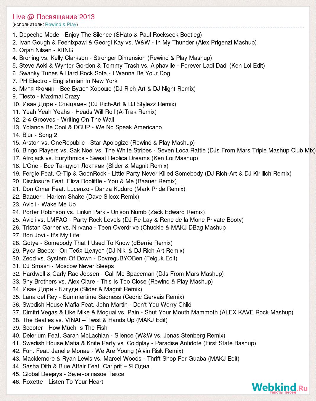 1. Depeche Mode - Enjoy The Silence (SHato & Paul Rockseek Bootleg) 2. Ivan Gough & Feenixpawl & Georgi Kay vs. W&W - In My Thunder (Alex Prigenzi Mashup) 3. Orjan Nilsen - XIING 4. Broning vs. Kelly Clarkson - Stronger Dimension (Rewind & Play Mashup) 5. Steve Aoki & Wynter Gordon & Tommy Trash vs. Alphaville - Forever Ladi Dadi (Ken Loi Edit) 6. Swanky Tunes & Hard Rock Sofa - I Wanna Be Your Dog 7. PH Electro - Englishman In New York 8. Митя Фомин - Все Будет Хорошо (DJ Rich-Art & DJ Night Remix) 9. Tiesto - Maximal Crazy 10. Иван Дорн - Стыцамен (DJ Rich-Art & DJ Stylezz Remix) 11. Yeah Yeah Yeahs - Heads Will Roll (A-Trak Remix) 12. 2-4 Grooves - Writing On The Wall 13. Yolanda Be Cool & DCUP - We No Speak Americano 14. Blur - Song 2 15. Arston vs. OneRepublic - Star Apologize (Rewind & Play Mashup) 16. Bingo Players vs. Sak Noel vs. The White Stripes - Seven Loca Rattle (DJs From Mars Triple Mashup Club Mix) 17. Afrojack vs. Eurythmics - Sweat Replica Dreams (Ken Loi Mashup) 18. L'One - Все Танцуют Локтями (Slider & Magnit Remix) 19. Fergie Feat. Q-Tip & GoonRock - Little Party Never Killed Somebody (DJ Rich-Art & DJ Kirillich Remix) 20. Disclosure Feat. Eliza Doolittle - You & Me (Baauer Remix) 21. Don Omar Feat. Lucenzo - Danza Kuduro (Mark Pride Remix) 22. Baauer - Harlem Shake (Dave Silcox Remix) 23. Avicii - Wake Me Up 24. Porter Robinson vs. Linkin Park - Unison Numb (Zack Edward Remix) 25. Avicii vs. LMFAO - Party Rock Levels (DJ Re-Lay & Rene de la Mone Private Booty) 26. Tristan Garner vs. Nirvana - Teen Overdrive (Chuckie & MAKJ DBag Mashup 27. Bon Jovi - It's My Life 28. Gotye - Somebody That I Used To Know (dBerrie Remix) 29. Руки Вверх - Он Тебя Целует (DJ Niki & DJ Rich-Art Remix) 30. Zedd vs. System Of Down - DovreguBYOBen (Felguk Edit) 31. DJ Smash - Moscow Never Sleeps 32. Hardwell & Carly Rae Jepsen - Call Me Spaceman (DJs From Mars Mashup) 33. Shy Brothers vs. Alex Clare - This Is Too Close (Rewind & Play Mashup) 34. Иван Дорн - Бигуди (Slider & Magnit Remix) 35. Lana del Rey - Summertime Sadness (Cedric Gervais Remix) 36. Swedish House Mafia Feat. John Martin - Don't You Worry Child 37. Dimitri Vegas & Like Mike & Moguai vs. Pain - Shut Your Mouth Mammoth (ALEX KAVE Rock Mashup) 38. The Beatles vs. VINAI – Twist & Hands Up (MAKJ Edit) 39. Scooter - How Much Is The Fish 40. Delerium Feat. Sarah McLachlan - Silence (W&W vs. Jonas Stenberg Remix) 41. Swedish House Mafia & Knife Party vs. Coldplay - Paradise Antidote (First State Bashup) 42. Fun. Feat. Janelle Monae - We Are Young (Alvin Risk Remix) 43. Macklemore & Ryan Lewis vs. Marcel Woods - Thrift Shop For Guaba (MAKJ Edit) 44. Sasha Dith & Blue Affair Feat. Carlprit – Я Одна 45. Global Deejays - Зеленоглазое Такси 46. Roxette - Listen To Your Heart