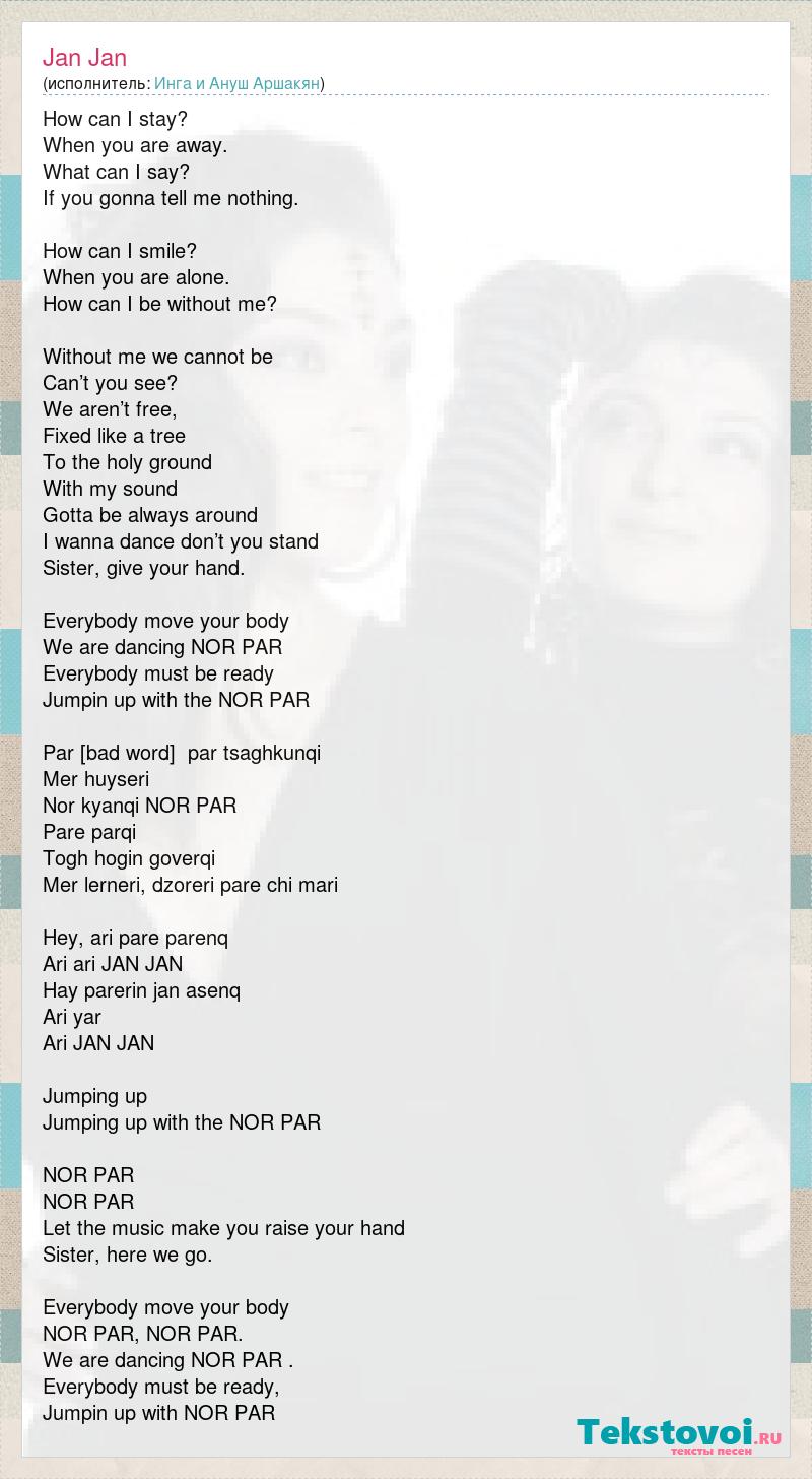 How can I stay? When you are away. What can I say? If you gonna tell me nothing. How can I smile? When you are alone. How can I be without me? Without me we cannot be Can’t you see? We aren’t free, Fixed like a tree To the holy ground With my sound Gotta be always around I wanna dance don’t you stand Sister, give your hand. Everybody move your body We are dancing NOR PAR Everybody must be ready Jumpin up with the NOR PAR Par garunqi, par tsaghkunqi Mer huyseri Nor kyanqi NOR PAR Pare parqi Togh hogin goverqi Mer lerneri, dzoreri pare chi mari Hey, ari pare parenq Ari ari JAN JAN Hay parerin jan asenq Ari yar Ari JAN JAN Jumping up Jumping up with the NOR PAR NOR PAR NOR PAR Let the music make you raise your hand Sister, here we go. Everybody move your body NOR PAR, NOR PAR. We are dancing NOR PAR . Everybody must be ready, Jumpin up with NOR PAR