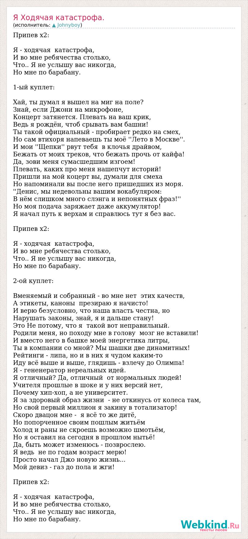 Припев x2: Я - ходячая катастрофа, И во мне ребячества столько, Что.. Я не услышу вас никогда, Но мне по барабану. 1-ый куплет: Хай, ты думал я вышел на миг на поле? Знай, если Джони на микрофоне, Концерт затянется. Плевать на ваш крик, Ведь я рождён, чтоб срывать вам башни! Ты такой официальный - пробирает редко на смех, Но сам втихоря напеваешь ты моё ''Лето в Москве''. И мои ''Щепки'' рвут тебя в клочья драйвом, Бежать от моих треков, что бежать прочь от кайфа! Да, зови меня сумасшедшим изгоем! Плевать, каких про меня нашепчут историй! Пришли на мой коцерт вы, думали для смеха Но напоминали вы после него пришедших из моря. ''Денис, мы недевольны вашим вокабуляром: В нём слишком много слэнга и непонятных фраз!'' Но моя подача заряжает даже аккумулятор! Я начал путь к верхам и справлюсь тут я без вас. Припев x2: Я - ходячая катастрофа, И во мне ребячества столько, Что.. Я не услышу вас никогда, Но мне по барабану. 2-ой куплет: Вменяемый и собранный - во мне нет этих качеств, А этикеты, каноны презираю я начисто! И верю безусловно, что наша власть честна, но Нарушать законы, знай, я и дальше стану! Это Не потому, что я такой вот неправильный. Родили меня, но походу мне в голову мозг не вставили! И вместо него в башке моей энергетика литры, Ты в компании со мной? Мы шашки две динамитных! Рейтинги - липа, но и в них я чудом каким-то Иду всё выше и выше, глядишь - взлечу до Олимпа! Я - гененератор нереальных идей. Я отличный? Да, отличный от нормальных людей! Учителя прошлые в шоке и у них версий нет, Почему хип-хоп, а не университет. Я за здоровый образ жизни - не откинусь от колеса там, Но свой первый миллион я закину в тотализатор! Скоро двацон мне - я всё то же дитё, Но попорченное своим пошлым житьём Холод и раны не скроешь возможно шмотьём, Но я оставил на сегодня в прошлом нытьё! Да, быть может изменюсь - позврослею. Я ведь не по годам возраст мерю! Просто начал Джо новую жизнь... Мой девиз - газ до пола и жги! Припев x2: Я - ходячая катастрофа, И во мне ребячества столько, Что.. Я не услышу вас никогда, Но мне по барабану.