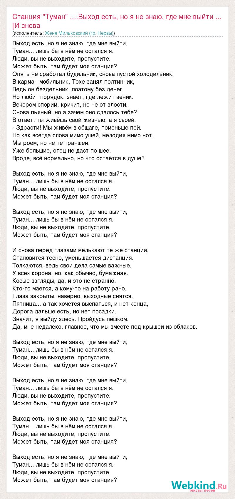 Выход есть, но я не знаю, где мне выйти, Туман... лишь бы в нём не остался я. Люди, вы не выходите, пропустите. Может быть, там будет моя станция? Опять не сработал будильник, снова пустой холодильник. В карман мобильник, Тохе занял полтинник, Ведь он бездельник, поэтому без денег. Но любит порядок, знает, где лежит веник. Вечером спорим, кричит, но не от злости. Снова пьяный, но а зачем оно сдалось тебе? В ответ: ты живёшь свой жизнью, а я своей. - Здрасти! Мы живём в общаге, поменьше пей. Но как всегда слова мимо ушей, мелодия мимо нот. Мы роем, но не те траншеи. Уже большие, отец не даст по шее. Вроде, всё нормально, но что остаётся в душе? Выход есть, но я не знаю, где мне выйти, Туман... лишь бы в нём не остался я. Люди, вы не выходите, пропустите. Может быть, там будет моя станция? Выход есть, но я не знаю, где мне выйти, Туман... лишь бы в нём не остался я. Люди, вы не выходите, пропустите. Может быть, там будет моя станция? И снова перед глазами мелькают те же станции, Становится тесно, уменьшается дистанция. Толкаются, ведь свои дела самые важные. У всех корона, но, как обычно, бумажная. Косые взгляды, да, и это не странно. Кто-то мается, а кому-то на работу рано. Глаза закрыты, наверно, выходные снятся. Пятница... а так хочется выспаться, и нет конца, Дорога дальше есть, но нет посадки. Значит, я выйду здесь. Пройдусь пешком. Да, мне недалеко, главное, что мы вместе под крышей из облаков. Выход есть, но я не знаю, где мне выйти, Туман... лишь бы в нём не остался я. Люди, вы не выходите, пропустите. Может быть, там будет моя станция? Выход есть, но я не знаю, где мне выйти, Туман... лишь бы в нём не остался я. Люди, вы не выходите, пропустите. Может быть, там будет моя станция? Выход есть, но я не знаю, где мне выйти, Туман... лишь бы в нём не остался я. Люди, вы не выходите, пропустите. Может быть, там будет моя станция? Выход есть, но я не знаю, где мне выйти, Туман... лишь бы в нём не остался я. Люди, вы не выходите, пропустите. Может быть, там будет моя станция?