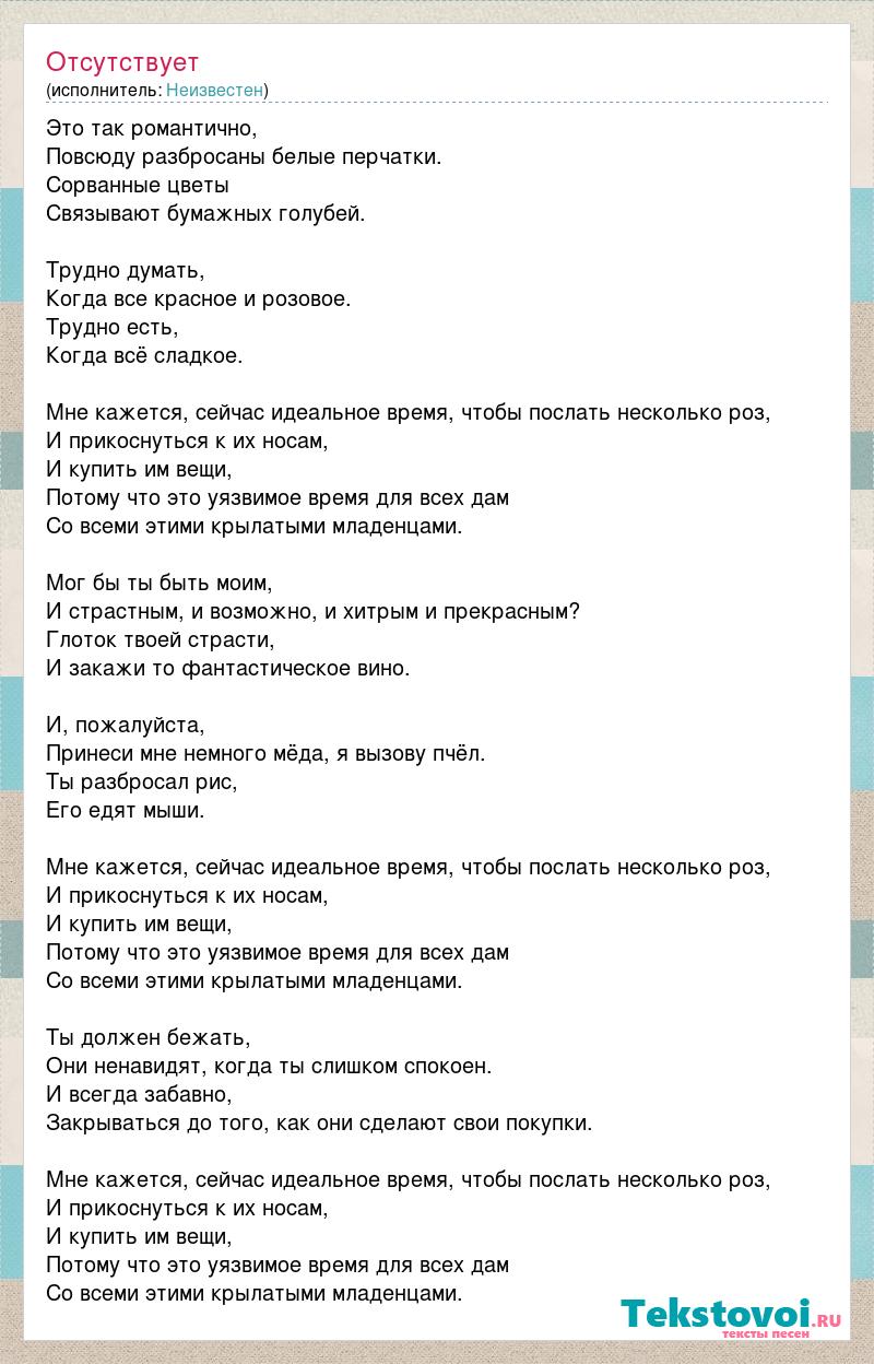 Это так романтично, Повсюду разбросаны белые перчатки. Сорванные цветы Связывают бумажных голубей. Трудно думать, Когда все красное и розовое. Трудно есть, Когда всё сладкое. Мне кажется, сейчас идеальное время, чтобы послать несколько роз, И прикоснуться к их носам, И купить им вещи, Потому что это уязвимое время для всех дам Со всеми этими крылатыми младенцами. Мог бы ты быть моим, И страстным, и возможно, и хитрым и прекрасным? Глоток твоей страсти, И закажи то фантастическое вино. И, пожалуйста, Принеси мне немного мёда, я вызову пчёл. Ты разбросал рис, Его едят мыши. Мне кажется, сейчас идеальное время, чтобы послать несколько роз, И прикоснуться к их носам, И купить им вещи, Потому что это уязвимое время для всех дам Со всеми этими крылатыми младенцами. Ты должен бежать, Они ненавидят, когда ты слишком спокоен. И всегда забавно, Закрываться до того, как они сделают свои покупки. Мне кажется, сейчас идеальное время, чтобы послать несколько роз, И прикоснуться к их носам, И купить им вещи, Потому что это уязвимое время для всех дам Со всеми этими крылатыми младенцами.