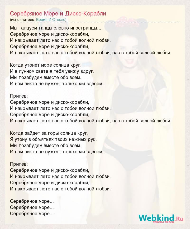 Мы танцуем танцы словно иностранцы... Серебряное море и диско-корабли, И накрывает лето нас с тобой волной любви. Серебряное море и диско-корабли, И накрывает лето нас с тобой волной любви, нас с тобой волной любви. Когда утонет море солнца круг, И в лунном свете я тебя увижу вдруг. Мы позабудем вместе обо всем. И нам никто не нужен, только мы вдвоем. Припев: Серебряное море и диско-корабли, И накрывает лето нас с тобой волной любви. Серебряное море и диско-корабли, И накрывает лето нас с тобой волной любви, нас с тобой волной любви. Когда зайдет за горы солнца круг, Я утону в объятьях твоих нежных рук. Мы позабудем вместе обо всем. И нам никто не нужен, только мы вдвоем. Припев: Серебряное море и диско-корабли, И накрывает лето нас с тобой волной любви. Серебряное море и диско-корабли, И накрывает лето нас с тобой волной любви. Серебряное море... Серебряное море... Серебряное море...