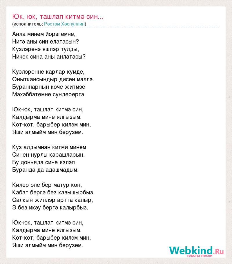 Анла минем йорэгемне, Нигэ аны син елатасын? Кузлэренэ яшлэр тулды, Ничек сина аны анлатасы? Кузлэренне карлар кумде, Оныткансындыр дисен мэллэ. Бураннарнын коче житмэс Мэхэббэтемне сундерергэ. Юк-юк, ташлап китмэ син, Калдырма мине ялгызым. Кот-кот, барыбер килэм мин, Яши алмыйм мин берузем. Куз алдымнан китми минем Синен нурлы карашларын. Бу доньяда сине язлэп Буранда да адашмадым. Килер эле бер матур кон, Кабат бергэ без кавышырбыз. Салкын жиллэр артта калыр, Э без икэу бергэ калырбыз. Юк-юк, ташлап китмэ син, Калдырма мине ялгызым. Кот-кот, барыбер килэм мин, Яши алмыйм мин берузем.