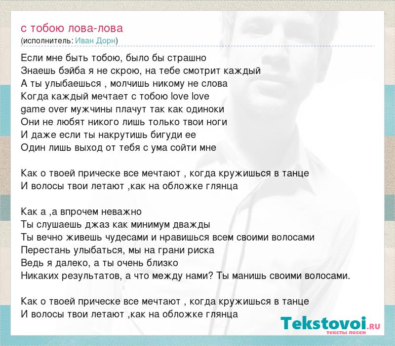 Если мне быть тобою, было бы страшно Знаешь бэйба я не скрою, на тебе смотрит каждый А ты улыбаешься , молчишь никому не слова Когда каждый мечтает с тобою love love game over мужчины плачут так как одиноки Они не любят никого лишь только твои ноги И даже если ты накрутишь бигуди ее Один лишь выход от тебя с ума сойти мне Как о твоей прическе все мечтают , когда кружишься в танце И волосы твои летают ,как на обложке глянца Как а ,а впрочем неважно Ты слушаешь джаз как минимум дважды Ты вечно живешь чудесами и нравишься всем своими волосами Перестань улыбаться, мы на грани риска Ведь я далеко, а ты очень близко Никаких результатов, а что между нами? Ты манишь своими волосами. Как о твоей прическе все мечтают , когда кружишься в танце И волосы твои летают ,как на обложке глянца