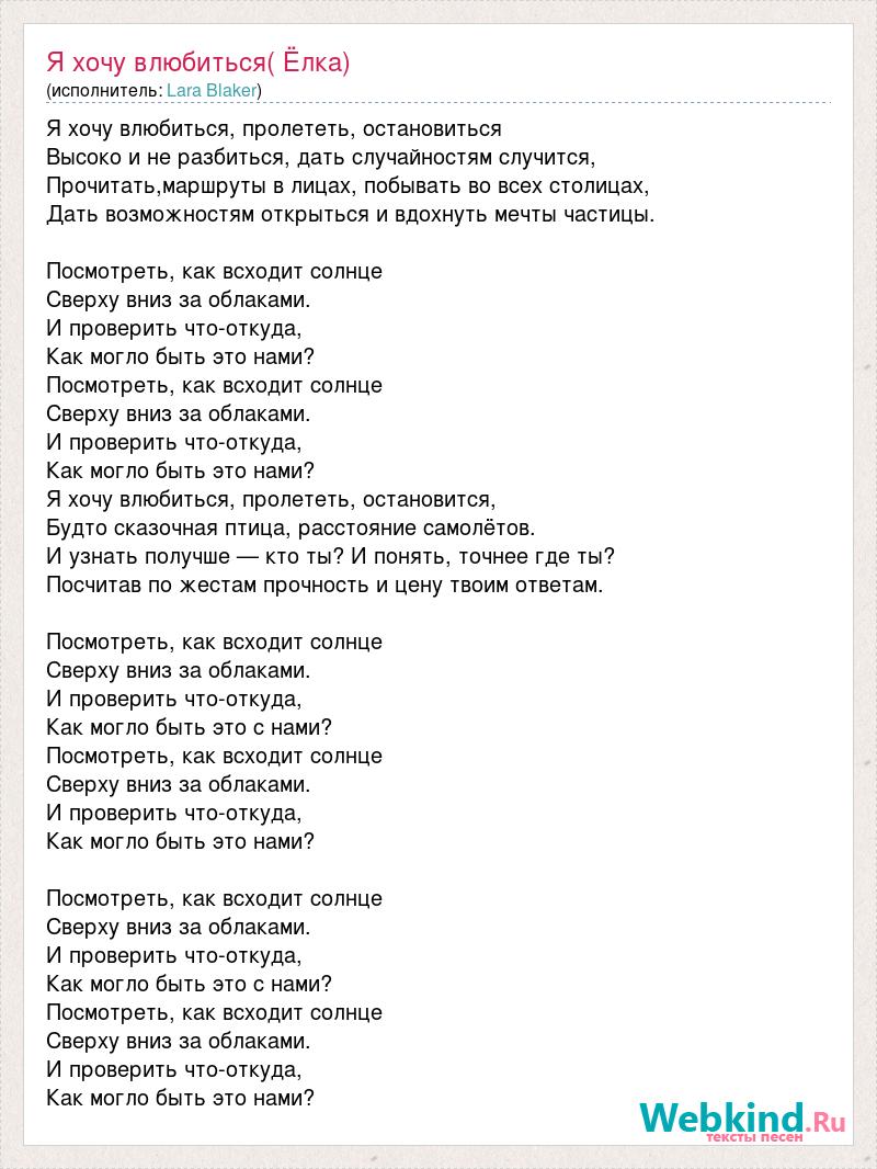 Я хочу влюбиться, пролететь, остановиться Высоко и не разбиться, дать случайностям случится, Прочитать,маршруты в лицах, побывать во всех столицах, Дать возможностям открыться и вдохнуть мечты частицы. Посмотреть, как всходит солнце Сверху вниз за облаками. И проверить что-откуда, Как могло быть это нами? Посмотреть, как всходит солнце Сверху вниз за облаками. И проверить что-откуда, Как могло быть это нами? Я хочу влюбиться, пролететь, остановится, Будто сказочная птица, расстояние самолётов. И узнать получше — кто ты? И понять, точнее где ты? Посчитав по жестам прочность и цену твоим ответам. Посмотреть, как всходит солнце Сверху вниз за облаками. И проверить что-откуда, Как могло быть это с нами? Посмотреть, как всходит солнце Сверху вниз за облаками. И проверить что-откуда, Как могло быть это нами? Посмотреть, как всходит солнце Сверху вниз за облаками. И проверить что-откуда, Как могло быть это с нами? Посмотреть, как всходит солнце Сверху вниз за облаками. И проверить что-откуда, Как могло быть это нами?