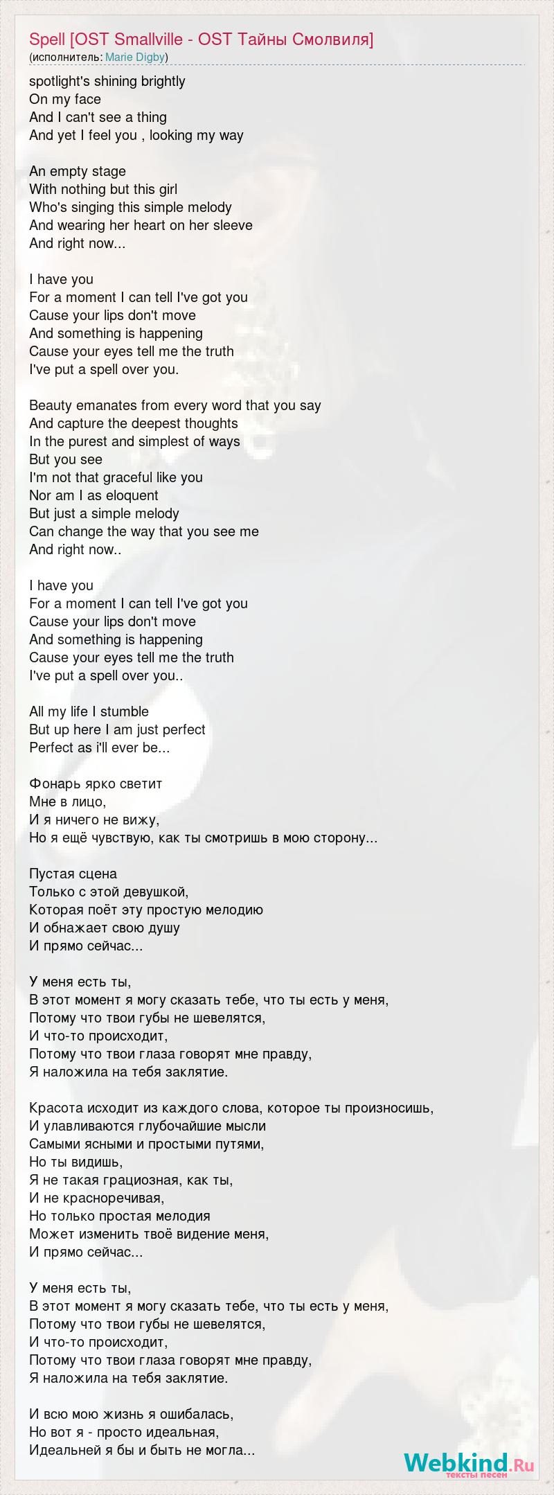 spotlight's shining brightly On my face And I can't see a thing And yet I feel you , looking my way An empty stage With nothing but this girl Who's singing this simple melody And wearing her heart on her sleeve And right now... I have you For a moment I can tell I've got you Cause your lips don't move And something is happening Cause your eyes tell me the truth I've put a spell over you. Beauty emanates from every word that you say And capture the deepest thoughts In the purest and simplest of ways But you see I'm not that graceful like you Nor am I as eloquent But just a simple melody Can change the way that you see me And right now.. I have you For a moment I can tell I've got you Cause your lips don't move And something is happening Cause your eyes tell me the truth I've put a spell over you.. All my life I stumble But up here I am just perfect Perfect as i'll ever be... Фонарь ярко светит Мне в лицо, И я ничего не вижу, Но я ещё чувствую, как ты смотришь в мою сторону... Пустая сцена Только с этой девушкой, Которая поёт эту простую мелодию И обнажает свою душу И прямо сейчас... У меня есть ты, В этот момент я могу сказать тебе, что ты есть у меня, Потому что твои губы не шевелятся, И что-то происходит, Потому что твои глаза говорят мне правду, Я наложила на тебя заклятие. Красота исходит из каждого слова, которое ты произносишь, И улавливаются глубочайшие мысли Самыми ясными и простыми путями, Но ты видишь, Я не такая грациозная, как ты, И не красноречивая, Но только простая мелодия Может изменить твоё видение меня, И прямо сейчас... У меня есть ты, В этот момент я могу сказать тебе, что ты есть у меня, Потому что твои губы не шевелятся, И что-то происходит, Потому что твои глаза говорят мне правду, Я наложила на тебя заклятие. И всю мою жизнь я ошибалась, Но вот я - просто идеальная, Идеальней я бы и быть не могла...