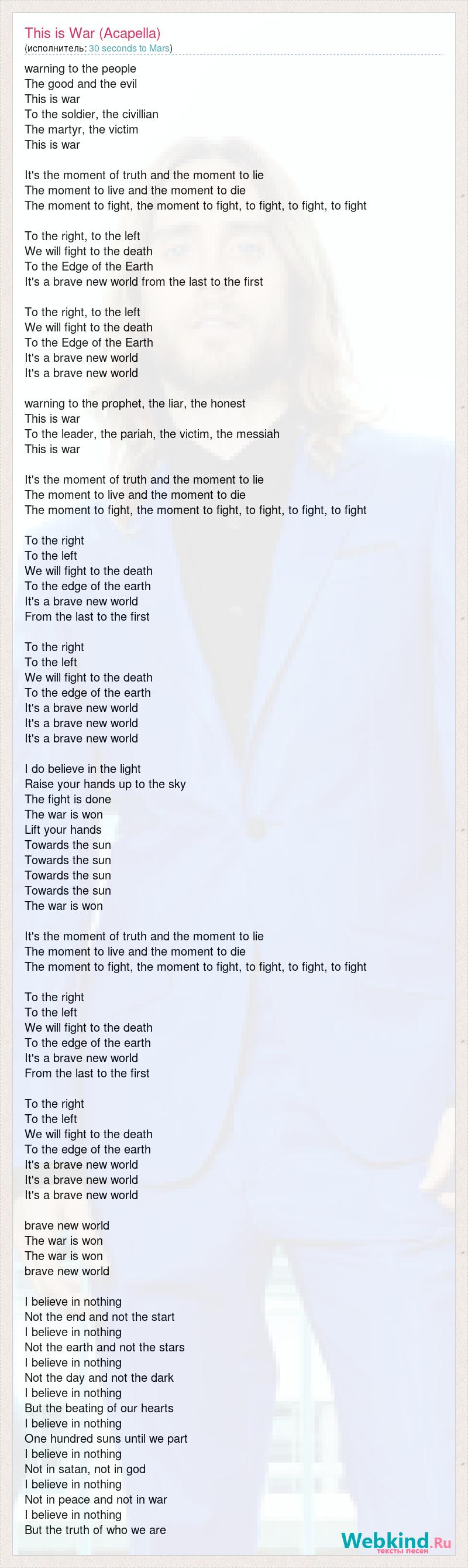 warning to the people The good and the evil This is war To the soldier, the civillian The martyr, the victim This is war It's the moment of truth and the moment to lie The moment to live and the moment to die The moment to fight, the moment to fight, to fight, to fight, to fight To the right, to the left We will fight to the death To the Edge of the Earth It's a brave new world from the last to the first To the right, to the left We will fight to the death To the Edge of the Earth It's a brave new world It's a brave new world warning to the prophet, the liar, the honest This is war To the leader, the pariah, the victim, the messiah This is war It's the moment of truth and the moment to lie The moment to live and the moment to die The moment to fight, the moment to fight, to fight, to fight, to fight To the right To the left We will fight to the death To the edge of the earth It's a brave new world From the last to the first To the right To the left We will fight to the death To the edge of the earth It's a brave new world It's a brave new world It's a brave new world I do believe in the light Raise your hands up to the sky The fight is done The war is won Lift your hands Towards the sun Towards the sun Towards the sun Towards the sun The war is won It's the moment of truth and the moment to lie The moment to live and the moment to die The moment to fight, the moment to fight, to fight, to fight, to fight To the right To the left We will fight to the death To the edge of the earth It's a brave new world From the last to the first To the right To the left We will fight to the death To the edge of the earth It's a brave new world It's a brave new world It's a brave new world brave new world The war is won The war is won brave new world I believe in nothing Not the end and not the start I believe in nothing Not the earth and not the stars I believe in nothing Not the day and not the dark I believe in nothing But the beating of our hearts I believe in nothing One hundred suns until we part I believe in nothing Not in satan, not in god I believe in nothing Not in peace and not in war I believe in nothing But the truth of who we are
