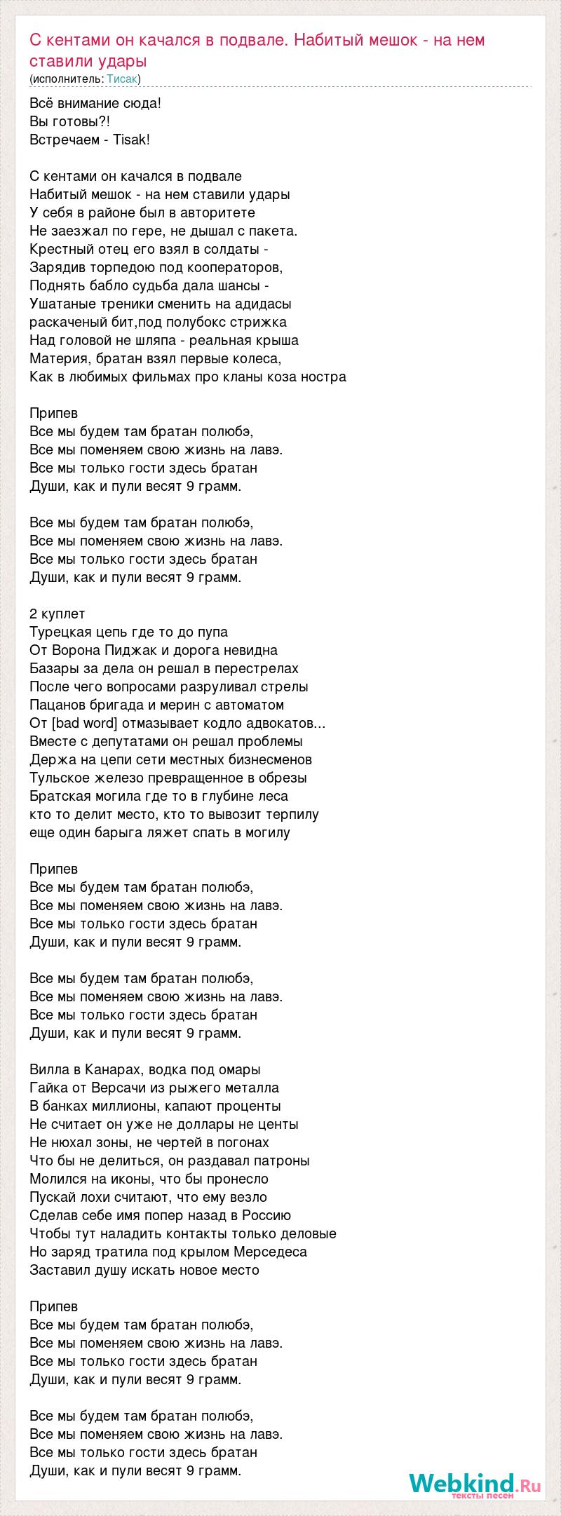 Всё внимание сюда! Вы готовы?! Встречаем - Tisak! С кентами он качался в подвале Набитый мешок - на нем ставили удары У себя в районе был в авторитете Не заезжал по гере, не дышал с пакета. Крестный отец его взял в солдаты - Зарядив торпедою под кооператоров, Поднять бабло судьба дала шансы - Ушатаные треники сменить на адидасы раскаченый бит,под полубокс стрижка Над головой не шляпа - реальная крыша Материя, братан взял первые колеса, Как в любимых фильмах про кланы коза ностра Припев Все мы будем там братан полюбэ, Все мы поменяем свою жизнь на лавэ. Все мы только гости здесь братан Души, как и пули весят 9 грамм. Все мы будем там братан полюбэ, Все мы поменяем свою жизнь на лавэ. Все мы только гости здесь братан Души, как и пули весят 9 грамм. 2 куплет Турецкая цепь где то до пупа От Ворона Пиджак и дорога невидна Базары за дела он решал в перестрелах После чего вопросами разруливал стрелы Пацанов бригада и мерин с автоматом От [bad word] отмазывает кодло адвокатов... Вместе с депутатами он решал проблемы Держа на цепи сети местных бизнесменов Тульское железо превращенное в обрезы Братская могила где то в глубине леса кто то делит место, кто то вывозит терпилу еще один барыга ляжет спать в могилу Припев Все мы будем там братан полюбэ, Все мы поменяем свою жизнь на лавэ. Все мы только гости здесь братан Души, как и пули весят 9 грамм. Все мы будем там братан полюбэ, Все мы поменяем свою жизнь на лавэ. Все мы только гости здесь братан Души, как и пули весят 9 грамм. Вилла в Канарах, водка под омары Гайка от Версачи из рыжего металла В банках миллионы, капают проценты Не считает он уже не доллары не центы Не нюхал зоны, не чертей в погонах Что бы не делиться, он раздавал патроны Молился на иконы, что бы пронесло Пускай лохи считают, что ему везло Сделав себе имя попер назад в Россию Чтобы тут наладить контакты только деловые Но заряд тратила под крылом Мерседеса Заставил душу искать новое место Припев Все мы будем там братан полюбэ, Все мы поменяем свою жизнь на лавэ. Все мы только гости здесь братан Души, как и пули весят 9 грамм. Все мы будем там братан полюбэ, Все мы поменяем свою жизнь на лавэ. Все мы только гости здесь братан Души, как и пули весят 9 грамм.