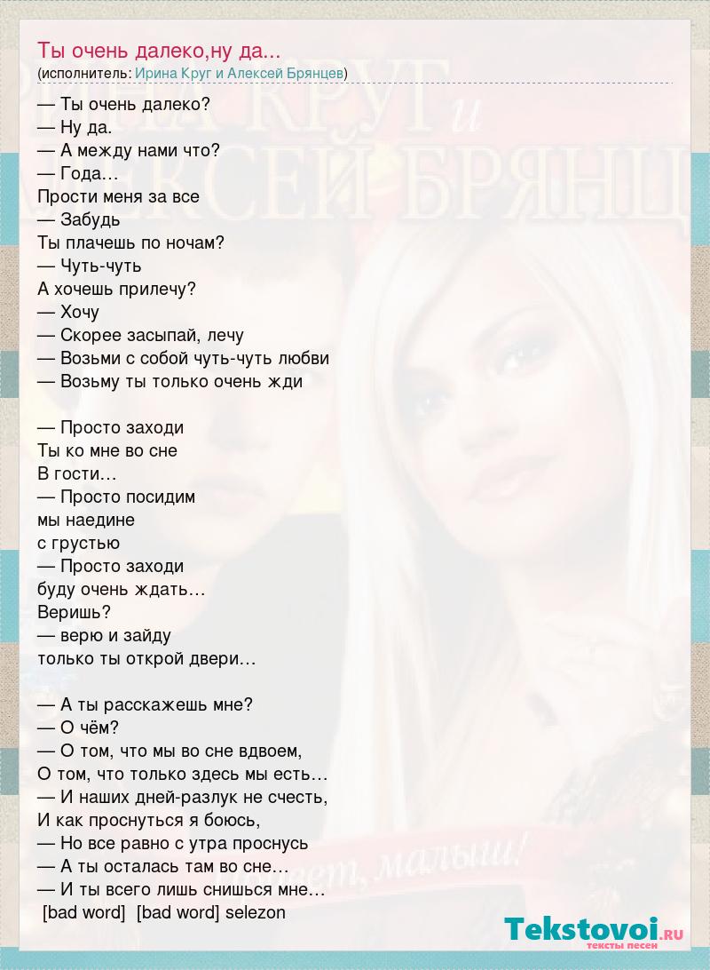 — Ты очень далеко? — Ну да. — А между нами что? — Года… Прости меня за все — Забудь Ты плачешь по ночам? — Чуть-чуть А хочешь прилечу? — Хочу — Скорее засыпай, лечу — Возьми с собой чуть-чуть любви — Возьму ты только очень жди — Просто заходи Ты ко мне во сне В гости… — Просто посидим мы наедине с грустью — Просто заходи буду очень ждать… Веришь? — верю и зайду только ты открой двери… — А ты расскажешь мне? — О чём? — О том, что мы во сне вдвоем, О том, что только здесь мы есть… — И наших дней-разлук не счесть, И как проснуться я боюсь, — Но все равно с утра проснусь — А ты осталась там во сне… — И ты всего лишь снишься мне… [bad word] [bad word] selezon