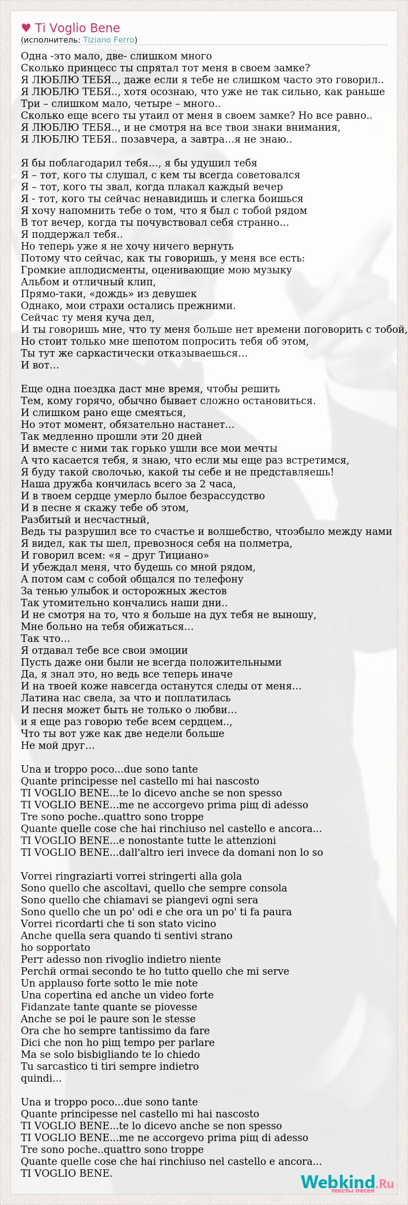Одна -это мало, две- слишком много Сколько принцесс ты спрятал тот меня в своем замке? Я ЛЮБЛЮ ТЕБЯ.., даже если я тебе не слишком часто это говорил.. Я ЛЮБЛЮ ТЕБЯ.., хотя осознаю, что уже не так сильно, как раньше Три – слишком мало, четыре – много.. Сколько еще всего ты утаил от меня в своем замке? Но все равно.. Я ЛЮБЛЮ ТЕБЯ.., и не смотря на все твои знаки внимания, Я ЛЮБЛЮ ТЕБЯ.. позавчера, а завтра…я не знаю.. Я бы поблагодарил тебя…, я бы удушил тебя Я – тот, кого ты слушал, с кем ты всегда советовался Я – тот, кого ты звал, когда плакал каждый вечер Я - тот, кого ты сейчас ненавидишь и слегка боишься Я хочу напомнить тебе о том, что я был с тобой рядом В тот вечер, когда ты почувствовал себя странно… Я поддержал тебя.. Но теперь уже я не хочу ничего вернуть Потому что сейчас, как ты говоришь, у меня все есть: Громкие аплодисменты, оценивающие мою музыку Альбом и отличный клип, Прямо-таки, «дождь» из девушек Однако, мои страхи остались прежними. Сейчас ту меня куча дел, И ты говоришь мне, что ту меня больше нет времени поговорить c тобой, Но стоит только мне шепотом попросить тебя об этом, Ты тут же саркастически отказываешься… И вот… Еще одна поездка даст мне время, чтобы решить Тем, кому горячо, обычно бывает сложно остановиться. И слишком рано еще смеяться, Но этот момент, обязательно настанет… Так медленно прошли эти 20 дней И вместе с ними так горько ушли все мои мечты А что касается тебя, я знаю, что если мы еще раз встретимся, Я буду такой сволочью, какой ты себе и не представляешь! Наша дружба кончилась всего за 2 часа, И в твоем сердце умерло былое безрассудство И в песне я скажу тебе об этом, Разбитый и несчастный, Ведь ты разрушил все то счастье и волшебство, чтоэбыло между нами Я видел, как ты шел, превознося себя на полметра, И говорил всем: «я – друг Тициано» И убеждал меня, что будешь со мной рядом, А потом сам с собой общался по телефону За тенью улыбок и осторожных жестов Так утомительно кончались наши дни.. И не смотря на то, что я больше на дух тебя не выношу, Мне больно на тебя обижаться… Так что… Я отдавал тебе все свои эмоции Пусть даже они были не всегда положительными Да, я знал это, но ведь все теперь иначе И на твоей коже навсегда останутся следы от меня… Латина нас свела, за что и поплатилась И песня может быть не только о любви… и я еще раз говорю тебе всем сердцем.., Что ты вот уже как две недели больше Не мой друг… Una и troppo poco...due sono tante Quante principesse nel castello mi hai nascosto TI VOGLIO BENE...te lo dicevo anche se non spesso TI VOGLIO BENE...me ne accorgevo prima piщ di adesso Tre sono poche..quattro sono troppe Quante quelle cose che hai rinchiuso nel castello e ancora... TI VOGLIO BENE...e nonostante tutte le attenzioni TI VOGLIO BENE...dall'altro ieri invece da domani non lo so Vorrei ringraziarti vorrei stringerti alla gola Sono quello che ascoltavi, quello che sempre consola Sono quello che chiamavi se piangevi ogni sera Sono quello che un po' odi e che ora un po' ti fa paura Vorrei ricordarti che ti son stato vicino Anche quella sera quando ti sentivi strano ho sopportato Perт adesso non rivoglio indietro niente Perchй ormai secondo te ho tutto quello che mi serve Un applauso forte sotto le mie note Una copertina ed anche un video forte Fidanzate tante quante se piovesse Anche se poi le paure son le stesse Ora che ho sempre tantissimo da fare Dici che non ho piщ tempo per parlare Ma se solo bisbigliando te lo chiedo Tu sarcastico ti tiri sempre indietro quindi... Una и troppo poco...due sono tante Quante principesse nel castello mi hai nascosto TI VOGLIO BENE...te lo dicevo anche se non spesso TI VOGLIO BENE...me ne accorgevo prima piщ di adesso Tre sono poche..quattro sono troppe Quante quelle cose che hai rinchiuso nel castello e ancora... TI VOGLIO BENE.