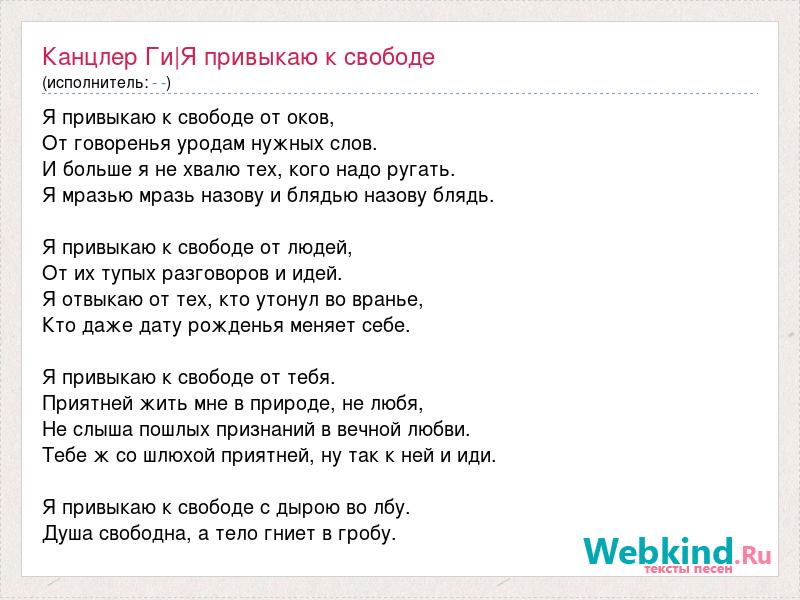 Я привыкаю к свободе от оков, От говоренья уродам нужных слов. И больше я не хвалю тех, кого надо ругать. Я мразью мразь назову и блядью назову блядь. Я привыкаю к свободе от людей, От их тупых разговоров и идей. Я отвыкаю от тех, кто утонул во вранье, Кто даже дату рожденья меняет себе. Я привыкаю к свободе от тебя. Приятней жить мне в природе, не любя, Не слыша пошлых признаний в вечной любви. Тебе ж со шлюхой приятней, ну так к ней и иди. Я привыкаю к свободе с дырою во лбу. Душа свободна, а тело гниет в гробу.