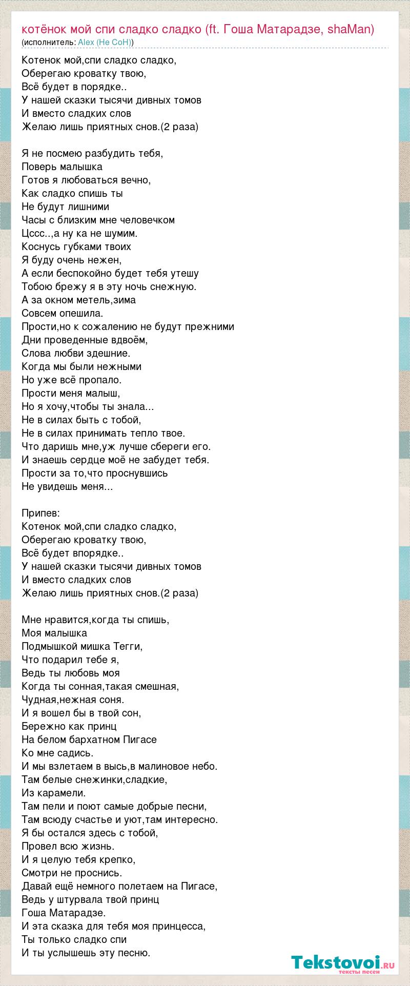 Котенок мой,спи сладко сладко, Оберегаю кроватку твою, Всё будет в порядке.. У нашей сказки тысячи дивных томов И вместо сладких слов Желаю лишь приятных снов.(2 раза) Я не посмею разбудить тебя, Поверь малышка Готов я любоваться вечно, Как сладко спишь ты Не будут лишними Часы с близким мне человечком Цссс..,а ну ка не шумим. Коснусь губками твоих Я буду очень нежен, А если беспокойно будет тебя утешу Тобою брежу я в эту ночь снежную. А за окном метель,зима Совсем опешила. Прости,но к сожалению не будут прежними Дни проведенные вдвоём, Слова любви здешние. Когда мы были нежными Но уже всё пропало. Прости меня малыш, Но я хочу,чтобы ты знала... Не в силах быть с тобой, Не в силах принимать тепло твое. Что даришь мне,уж лучше сбереги его. И знаешь сердце моё не забудет тебя. Прости за то,что проснувшись Не увидешь меня... Припев: Котенок мой,спи сладко сладко, Оберегаю кроватку твою, Всё будет впорядке.. У нашей сказки тысячи дивных томов И вместо сладких слов Желаю лишь приятных снов.(2 раза) Мне нравится,когда ты спишь, Моя малышка Подмышкой мишка Тегги, Что подарил тебе я, Ведь ты любовь моя Когда ты сонная,такая смешная, Чудная,нежная соня. И я вошел бы в твой сон, Бережно как принц На белом бархатном Пигасе Ко мне садись. И мы взлетаем в высь,в малиновое небо. Там белые снежинки,сладкие, Из карамели. Там пели и поют самые добрые песни, Там всюду счастье и уют,там интересно. Я бы остался здесь с тобой, Провел всю жизнь. И я целую тебя крепко, Смотри не проснись. Давай ещё немного полетаем на Пигасе, Ведь у штурвала твой принц Гоша Матарадзе. И эта сказка для тебя моя принцесса, Ты только сладко спи И ты услышешь эту песню.