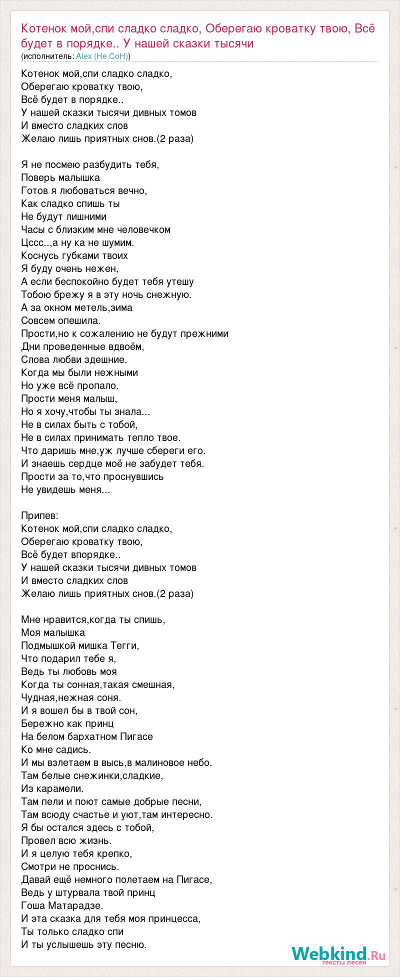 Котенок мой,спи сладко сладко, Оберегаю кроватку твою, Всё будет в порядке.. У нашей сказки тысячи дивных томов И вместо сладких слов Желаю лишь приятных снов.(2 раза) Я не посмею разбудить тебя, Поверь малышка Готов я любоваться вечно, Как сладко спишь ты Не будут лишними Часы с близким мне человечком Цссс..,а ну ка не шумим. Коснусь губками твоих Я буду очень нежен, А если беспокойно будет тебя утешу Тобою брежу я в эту ночь снежную. А за окном метель,зима Совсем опешила. Прости,но к сожалению не будут прежними Дни проведенные вдвоём, Слова любви здешние. Когда мы были нежными Но уже всё пропало. Прости меня малыш, Но я хочу,чтобы ты знала... Не в силах быть с тобой, Не в силах принимать тепло твое. Что даришь мне,уж лучше сбереги его. И знаешь сердце моё не забудет тебя. Прости за то,что проснувшись Не увидешь меня... Припев: Котенок мой,спи сладко сладко, Оберегаю кроватку твою, Всё будет впорядке.. У нашей сказки тысячи дивных томов И вместо сладких слов Желаю лишь приятных снов.(2 раза) Мне нравится,когда ты спишь, Моя малышка Подмышкой мишка Тегги, Что подарил тебе я, Ведь ты любовь моя Когда ты сонная,такая смешная, Чудная,нежная соня. И я вошел бы в твой сон, Бережно как принц На белом бархатном Пигасе Ко мне садись. И мы взлетаем в высь,в малиновое небо. Там белые снежинки,сладкие, Из карамели. Там пели и поют самые добрые песни, Там всюду счастье и уют,там интересно. Я бы остался здесь с тобой, Провел всю жизнь. И я целую тебя крепко, Смотри не проснись. Давай ещё немного полетаем на Пигасе, Ведь у штурвала твой принц Гоша Матарадзе. И эта сказка для тебя моя принцесса, Ты только сладко спи И ты услышешь эту песню.