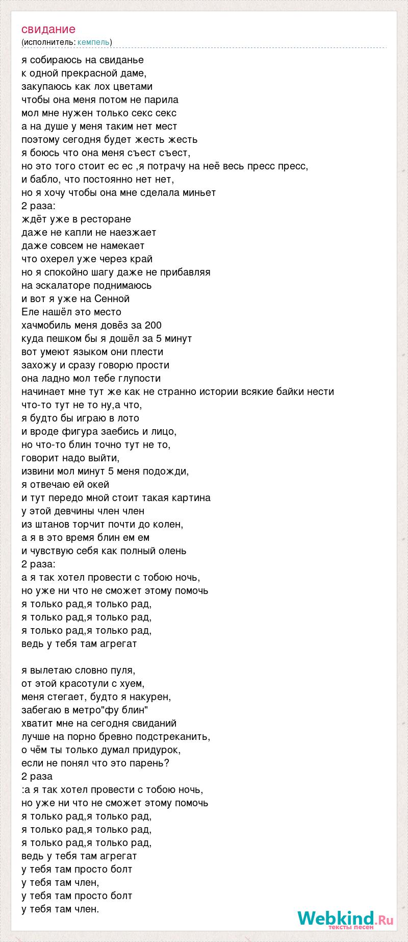 я собираюсь на свиданье к одной прекрасной даме, закупаюсь как лох цветами чтобы она меня потом не парила мол мне нужен только секс секс а на душе у меня таким нет мест поэтому сегодня будет жесть жесть я боюсь что она меня съест съест, но это того стоит ес ес ,я потрачу на неё весь пресс пресс, и бабло, что постоянно нет нет, но я хочу чтобы она мне сделала миньет 2 раза: ждёт уже в ресторане даже не капли не наезжает даже совсем не намекает что охерел уже через край но я спокойно шагу даже не прибавляя на эскалаторе поднимаюсь и вот я уже на Сенной Еле нашёл это место хачмобиль меня довёз за 200 куда пешком бы я дошёл за 5 минут вот умеют языком они плести захожу и сразу говорю прости она ладно мол тебе глупости начинает мне тут же как не странно истории всякие байки нести что-то тут не то ну,а что, я будто бы играю в лото и вроде фигура заебись и лицо, но что-то блин точно тут не то, говорит надо выйти, извини мол минут 5 меня подожди, я отвечаю ей окей и тут передо мной стоит такая картина у этой девчины член член из штанов торчит почти до колен, а я в это время блин ем ем и чувствую себя как полный олень 2 раза: а я так хотел провести с тобою ночь, но уже ни что не сможет этому помочь я только рад,я только рад, я только рад,я только рад, я только рад,я только рад, ведь у тебя там агрегат я вылетаю словно пуля, от этой красотули с хуем, меня стегает, будто я накурен, забегаю в метро"фу блин" хватит мне на сегодня свиданий лучше на порно бревно подстреканить, о чём ты только думал придурок, если не понял что это парень? 2 раза :а я так хотел провести с тобою ночь, но уже ни что не сможет этому помочь я только рад,я только рад, я только рад,я только рад, я только рад,я только рад, ведь у тебя там агрегат у тебя там просто болт у тебя там член, у тебя там просто болт у тебя там член.