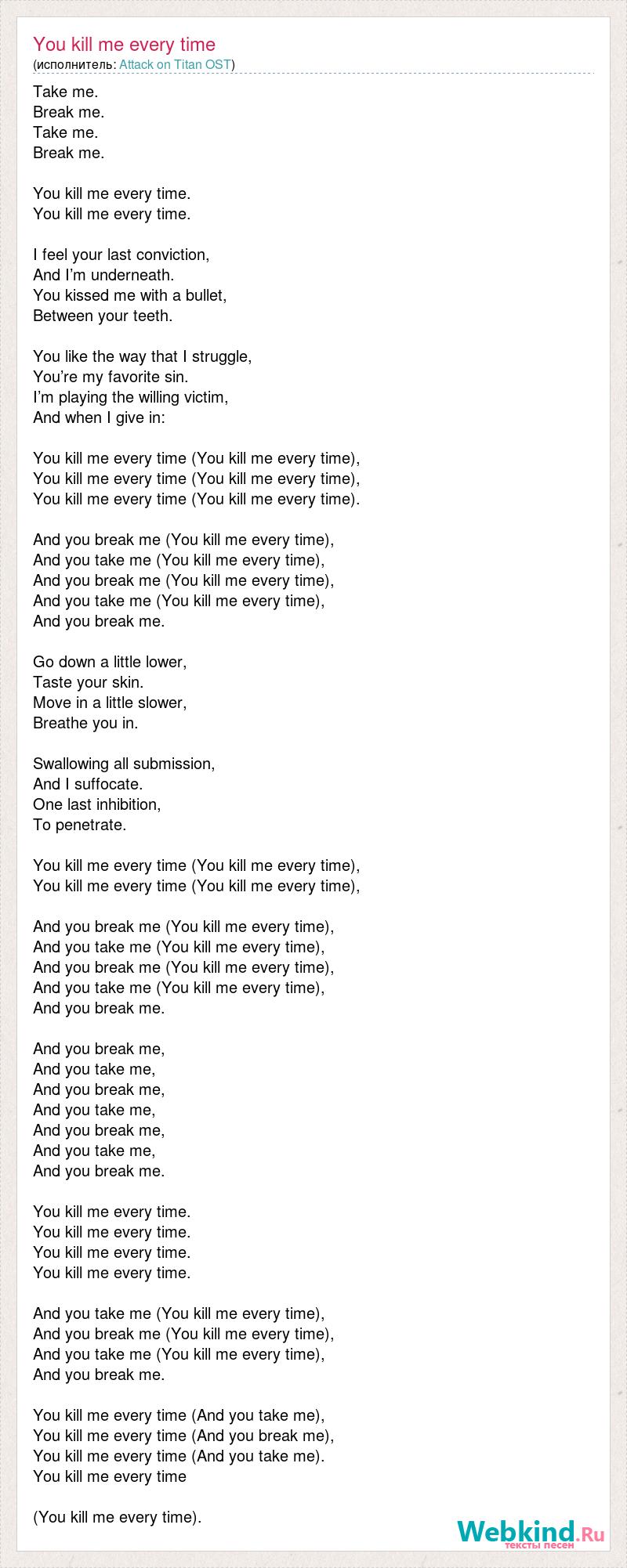 Take me. Break me. Take me. Break me. You kill me every time. You kill me every time. I feel your last conviction, And I’m underneath. You kissed me with a bullet, Between your teeth. You like the way that I struggle, You’re my favorite sin. I’m playing the willing victim, And when I give in: You kill me every time (You kill me every time), You kill me every time (You kill me every time), You kill me every time (You kill me every time). And you break me (You kill me every time), And you take me (You kill me every time), And you break me (You kill me every time), And you take me (You kill me every time), And you break me. Go down a little lower, Taste your skin. Move in a little slower, Breathe you in. Swallowing all submission, And I suffocate. One last inhibition, To penetrate. You kill me every time (You kill me every time), You kill me every time (You kill me every time), And you break me (You kill me every time), And you take me (You kill me every time), And you break me (You kill me every time), And you take me (You kill me every time), And you break me. And you break me, And you take me, And you break me, And you take me, And you break me, And you take me, And you break me. You kill me every time. You kill me every time. You kill me every time. You kill me every time. And you take me (You kill me every time), And you break me (You kill me every time), And you take me (You kill me every time), And you break me. You kill me every time (And you take me), You kill me every time (And you break me), You kill me every time (And you take me). You kill me every time (You kill me every time).