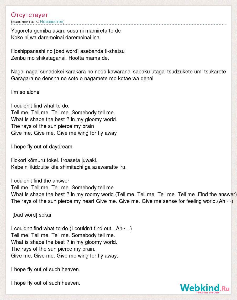 Yogoreta gomiba asaru susu ni mamireta te de Koko ni wa daremoinai daremoinai inai Hoshippanashi no [bad word] asebanda ti-shatsu Zenbu mo shikataganai. Hootta mama de. Nagai nagai sunadokei karakara no nodo kawaranai sabaku utagai tsudzukete umi tsukarete Garagara no densha no soto o nagamete mo kotae wa denai I'm so alone I couldn't find what to do. Tell me. Tell me. Tell me. Somebody tell me. What is shape the best ? in my gloomy world. The rays of the sun pierce my brain Give me. Give me. Give me wing for fly away I hope fly out of daydream Hokori kōmuru tokei. Iroaseta juwaki. Kabe ni ikidzuite kita shimitachi ga azawaratte iru. I couldn't find the answer Tell me. Tell me. Tell me. Somebody tell me. What is shape the best ? in my roomy world.(Tell me. Tell me. Tell me. Tell me. Find the answer) The rays of the sun pierce my heart Give me. Give me. Give me sense for feeling world.(Ah~~) [bad word] sekai I couldn't find what to do.(I couldn't find out...Ah~...) Tell me. Tell me. Tell me. Somebody tell me. What is shape the best ? in my gloomy world. The rays of the sun pierce my brain. Give me. Give me. Give me wing for fly away. I hope fly out of such heaven. I hope fly out of such heaven.