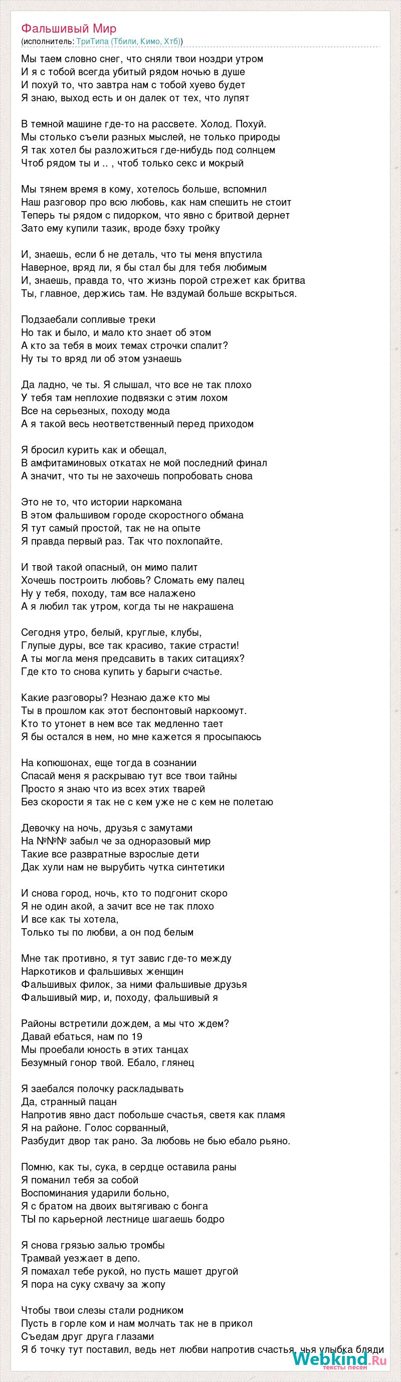 Мы таем словно снег, что сняли твои ноздри утром И я с тобой всегда убитый рядом ночью в душе И похуй то, что завтра нам с тобой хуево будет Я знаю, выход есть и он далек от тех, что лупят В темной машине где-то на рассвете. Холод. Похуй. Мы столько съели разных мыслей, не только природы Я так хотел бы разложиться где-нибудь под солнцем Чтоб рядом ты и .. , чтоб только секс и мокрый Мы тянем время в кому, хотелось больше, вспомнил Наш разговор про всю любовь, как нам спешить не стоит Теперь ты рядом с пидорком, что явно с бритвой дернет Зато ему купили тазик, вроде бэху тройку И, знаешь, если б не деталь, что ты меня впустила Наверное, вряд ли, я бы стал бы для тебя любимым И, знаешь, правда то, что жизнь порой стрежет как бритва Ты, главное, держись там. Не вздумай больше вскрыться. Подзаебали сопливые треки Но так и было, и мало кто знает об этом А кто за тебя в моих темах строчки спалит? Ну ты то вряд ли об этом узнаешь Да ладно, че ты. Я слышал, что все не так плохо У тебя там неплохие подвязки с этим лохом Все на серьезных, походу мода А я такой весь неответственный перед приходом Я бросил курить как и обещал, В амфитаминовых откатах не мой последний финал А значит, что ты не захочешь попробовать снова Это не то, что истории наркомана В этом фальшивом городе скоростного обмана Я тут самый простой, так не на опыте Я правда первый раз. Так что похлопайте. И твой такой опасный, он мимо палит Хочешь построить любовь? Сломать ему палец Ну у тебя, походу, там все налажено А я любил так утром, когда ты не накрашена Сегодня утро, белый, круглые, клубы, Глупые дуры, все так красиво, такие страсти! А ты могла меня предсавить в таких ситациях? Где кто то снова купить у барыги счастье. Какие разговоры? Незнаю даже кто мы Ты в прошлом как этот беспонтовый наркоомут. Кто то утонет в нем все так медленно тает Я бы остался в нем, но мне кажется я просыпаюсь На копюшонах, еще тогда в сознании Спасай меня я раскрываю тут все твои тайны Просто я знаю что из всех этих тварей Без скорости я так не с кем уже не с кем не полетаю Девочку на ночь, друзья с замутами На №№№ забыл че за одноразовый мир Такие все развратные взрослые дети Дак хули нам не вырубить чутка синтетики И снова город, ночь, кто то подгонит скоро Я не один акой, а зачит все не так плохо И все как ты хотела, Только ты по любви, а он под белым Мне так противно, я тут завис где-то между Наркотиков и фальшивых женщин Фальшивых филок, за ними фальшивые друзья Фальшивый мир, и, походу, фальшивый я Районы встретили дождем, а мы что ждем? Давай ебаться, нам по 19 Мы проебали юность в этих танцах Безумный гонор твой. Ебало, глянец Я заебался полочку раскладывать Да, странный пацан Напротив явно даст побольше счастья, светя как пламя Я на районе. Голос сорванный, Разбудит двор так рано. За любовь не бью ебало рьяно. Помню, как ты, сука, в сердце оставила раны Я поманил тебя за собой Воспоминания ударили больно, Я с братом на двоих вытягиваю с бонга ТЫ по карьерной лестнице шагаешь бодро Я снова грязью залью тромбы Трамвай уезжает в депо. Я помахал тебе рукой, но пусть машет другой Я пора на суку схвачу за жопу Чтобы твои слезы стали родником Пусть в горле ком и нам молчать так не в прикол Съедам друг друга глазами Я б точку тут поставил, ведь нет любви напротив счастья, чья улыбка бляди