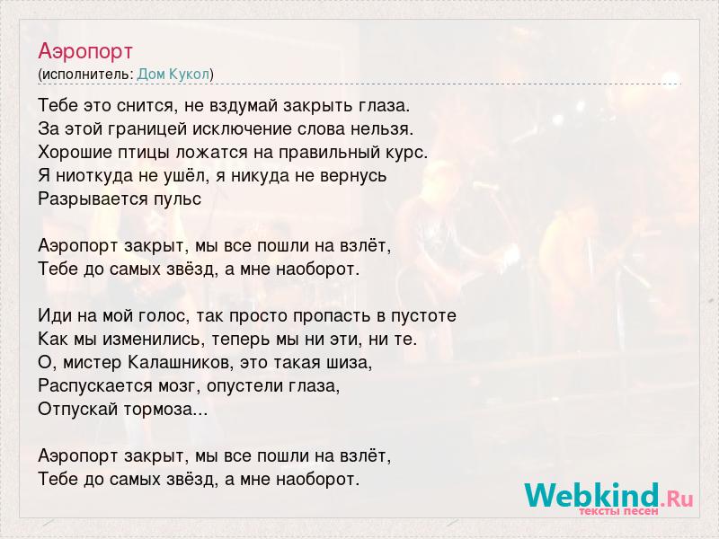 Тебе это снится, не вздумай закрыть глаза. За этой границей исключение слова нельзя. Хорошие птицы ложатся на правильный курс. Я ниоткуда не ушёл, я никуда не вернусь Разрывается пульс Аэропорт закрыт, мы все пошли на взлёт, Тебе до самых звёзд, а мне наоборот. Иди на мой голос, так просто пропасть в пустоте Как мы изменились, теперь мы ни эти, ни те. О, мистер Калашников, это такая шиза, Распускается мозг, опустели глаза, Отпускай тормоза... Аэропорт закрыт, мы все пошли на взлёт, Тебе до самых звёзд, а мне наоборот.