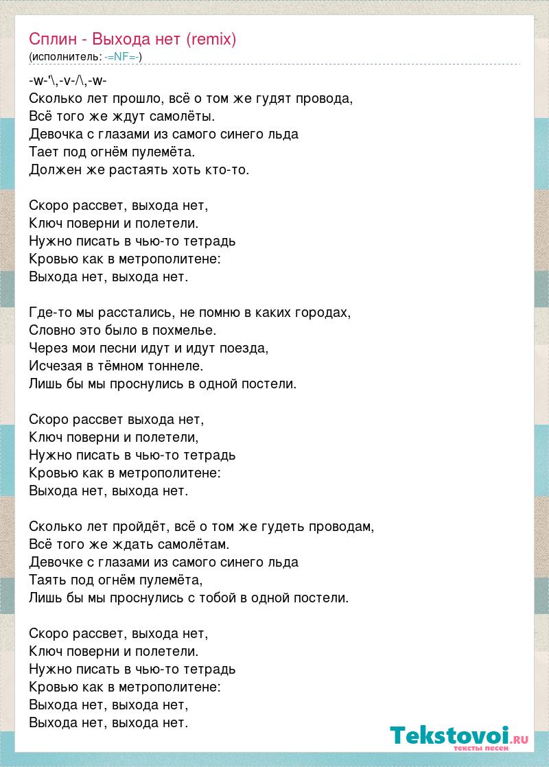 -w-'\,-v-/\,-w- Сколько лет прошло, всё о том же гудят провода, Всё того же ждут самолёты. Девочка с глазами из самого синего льда Тает под огнём пулемёта. Должен же растаять хоть кто-то. Скоро рассвет, выхода нет, Ключ поверни и полетели. Нужно писать в чью-то тетрадь Кровью как в метрополитене: Выхода нет, выхода нет. Где-то мы расстались, не помню в каких городах, Словно это было в похмелье. Через мои песни идут и идут поезда, Исчезая в тёмном тоннеле. Лишь бы мы проснулись в одной постели. Скоро рассвет выхода нет, Ключ поверни и полетели, Нужно писать в чью-то тетрадь Кровью как в метрополитене: Выхода нет, выхода нет. Сколько лет пройдёт, всё о том же гудеть проводам, Всё того же ждать самолётам. Девочке с глазами из самого синего льда Таять под огнём пулемёта, Лишь бы мы проснулись с тобой в одной постели. Скоро рассвет, выхода нет, Ключ поверни и полетели. Нужно писать в чью-то тетрадь Кровью как в метрополитене: Выхода нет, выхода нет, Выхода нет, выхода нет.