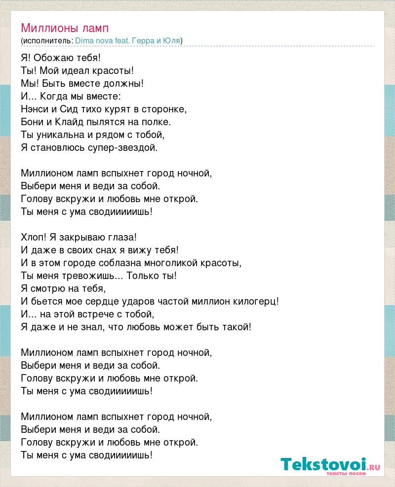 Я! Обожаю тебя! Ты! Мой идеал красоты! Мы! Быть вместе должны! И... Когда мы вместе: Нэнси и Сид тихо курят в сторонке, Бони и Клайд пылятся на полке. Ты уникальна и рядом с тобой, Я становлюсь супер-звездой. Миллионом ламп вспыхнет город ночной, Выбери меня и веди за собой. Голову вскружи и любовь мне открой. Ты меня с ума сводииииишь! Хлоп! Я закрываю глаза! И даже в своих снах я вижу тебя! И в этом городе соблазна многоликой красоты, Ты меня тревожишь... Только ты! Я смотрю на тебя, И бьется мое сердце ударов частой миллион килогерц! И... на этой встрече с тобой, Я даже и не знал, что любовь может быть такой! Миллионом ламп вспыхнет город ночной, Выбери меня и веди за собой. Голову вскружи и любовь мне открой. Ты меня с ума сводииииишь! Миллионом ламп вспыхнет город ночной, Выбери меня и веди за собой. Голову вскружи и любовь мне открой. Ты меня с ума сводииииишь!